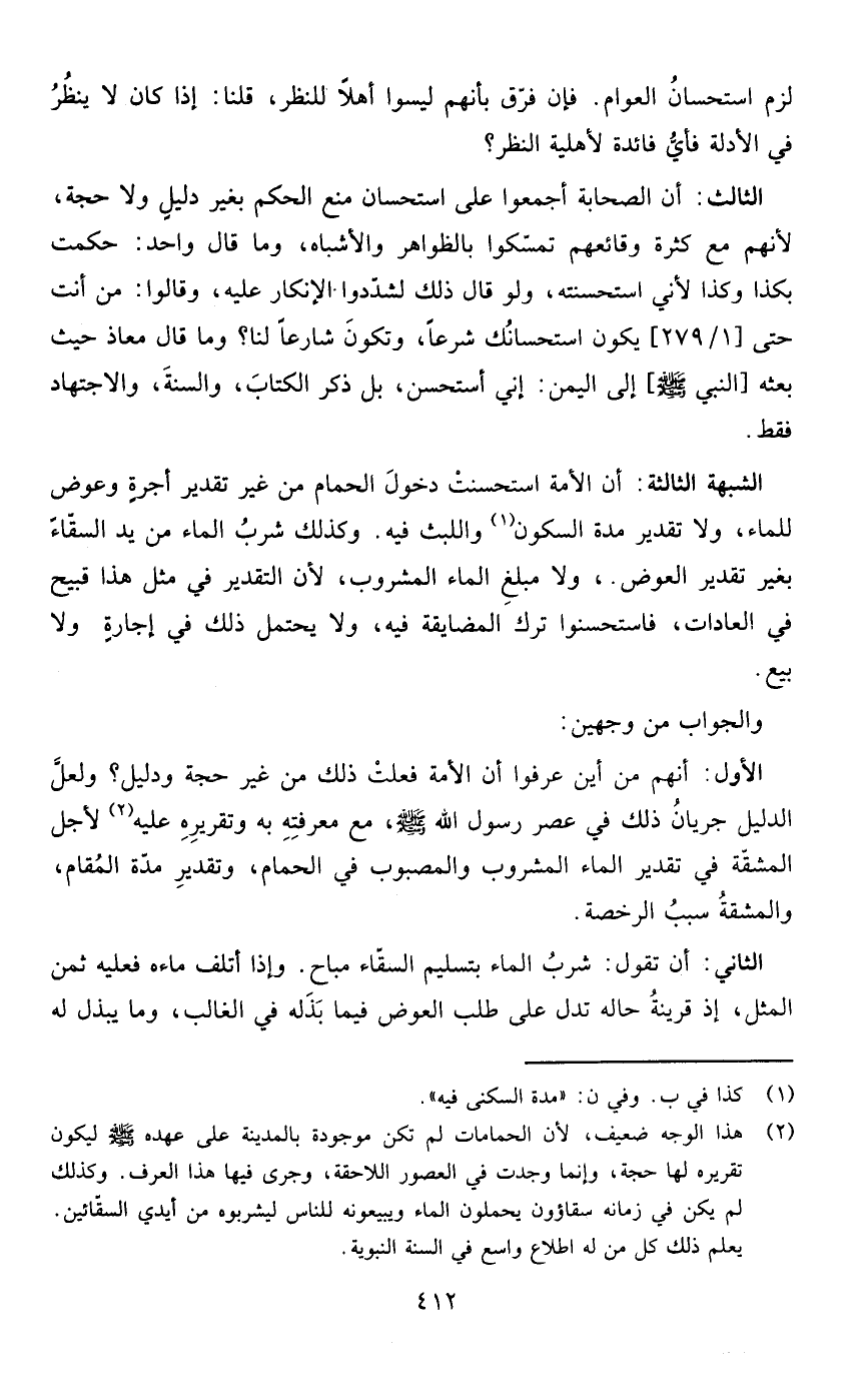 الشبهة الثالثة: إن الأمة استحسنت دخول الحمام من غير تقدير أجرة وعوض الماء ولا تقدير مدة السكون واللبث فيه وكذلك شرب الماء من يد السقاء بغير تقدير العوض ولا مبلغ الماء المشروب لأن التقدير في مثل هذا قبيح في العادات فاستحسنوا ترك المضايقة فيه ولا يحتمل ذلك في إجارة ولا بيع