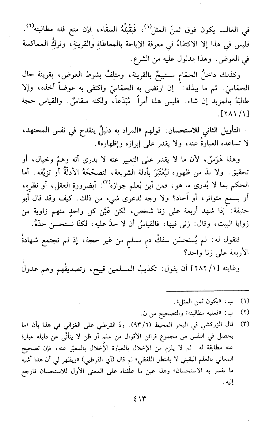 وهذا هوس لأن ما لا يقدر على التعبير عنه لا يدري أنه وهم وخيال أو تحقيق ولا بد من ظهوره ليعتبر بأدلة الشريعة لتصححه الأدلة أو تزيفه أما الحكم بما لا يدري ما هو فمن أين يعلم جوازه أبضرورة العقل أو نظره أو بسمع متواتر أو آحاد ؟ ولا وجه لدعوى شيء من ذلك كيف وقد قال أبو حنيفة إذا شهد أربعة على زنا شخص لكن عين كل واحد منهم زاوية من زوايا البيت وقال زنى فيها فالقياس أن لا حد عليه لكنا نستحسن حده