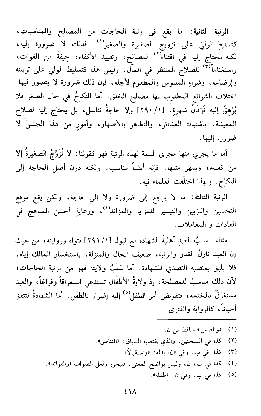 الرتبة الثانية: ما يقع في رتبة الحاجات من المصالح والمناسبات كتسليط الولي على تزويج الصغيرة والصغير فذلك لا ضرورة إليه لكنه محتاج إليه في اقتناء المصالح وتقييد الأكفاء خيفة من الفوات واستغناما للصلاح المنتظر في المآل وليس هذا كتسليط الولي على تربيته وإرضاعه وشراء الملبوس والمطعوم لأجله فإن ذلك ضرورة لا يتصور فيها اختلاف الشرائع المطلوب بها مصالح الخلق أما النكاح في حال الصغر فلا يرهق إليه توقان شهوة ولا حاجة تناسل بل يحتاج إليه لصلاح المعيشة باشتباك العشائر والتظاهر بالإصهار وأمور من هذا الجنس لا ضرورة إليها