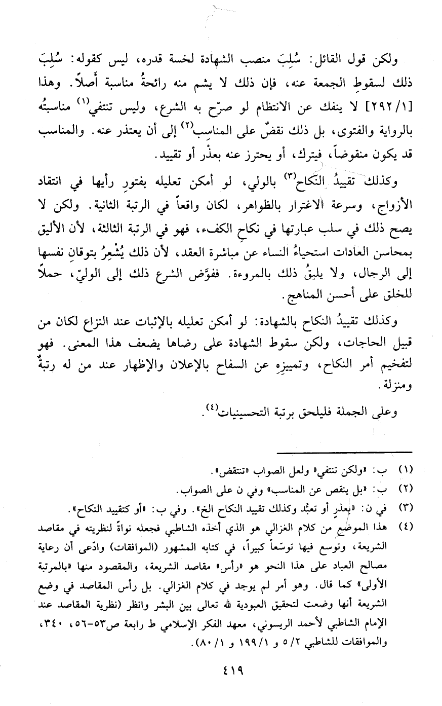 كتقييد النكاح بالولي لو أمكن تعليله بفتور رأيها في انتقاء الأزواج وسرعة الاغترار بالظواهر لكان واقعا في الرتبة الثانية ولكن لا يصح ذلك في سلب عبارتها وفي نكاح الكفؤ فهو في الرتبة الثالثة لأن ألأليق بمحاسن العادات استحياء النساء عن مباشرة العقد لأن ذلك يشعر بتوقان نفسها إلى الرجال ولا يليق ذلك بالمروءة ففوض الشرع ذلك إلى الولي حملا للخلق على أحسن المناهج