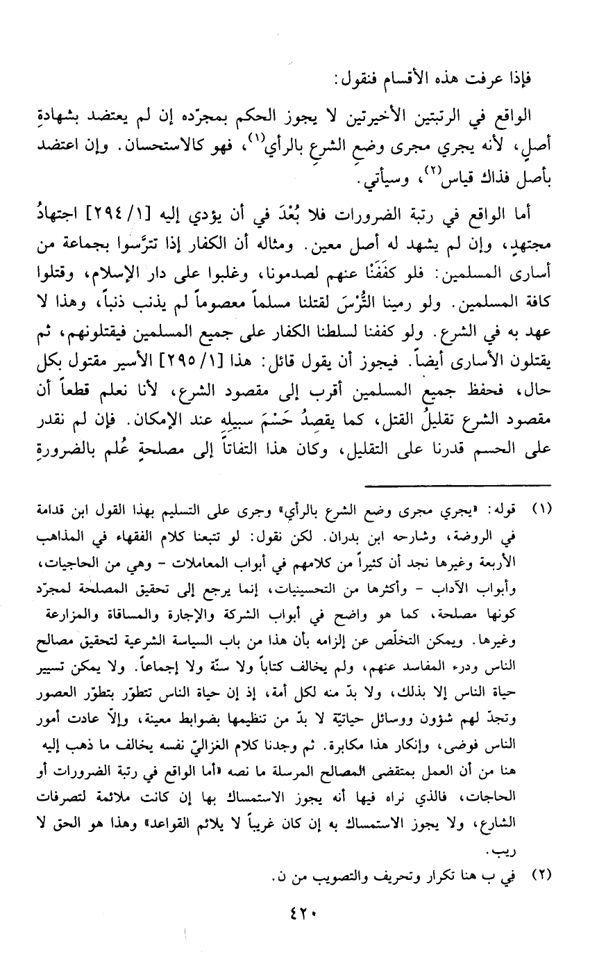 أما الواقع في رتبة الضرورات فلا بعد في أن يؤدي إليه اجتهاد وإن لم يشهد له أصل معين ومثاله إن الكفار إذا تترسوا بجماعة من أسارى المسلمين فلو كففنا عنهم لصدمونا وغلبوا على دار الإسلام وقتلوا كافة المسلمين ولو رمينا الترس لقتلنا مسلما معصوما لم يذنب ذنبا وهذا لا عهد به في الشرع ولو كففنا لسلطنا الكفار على جميع المسلمين فيقتلونهم ثم يقتلون الأسارى أيضا فيجوز أن يقول قائل هذا الأسير مقتول بكل حال فحفظ جميع المسلمين أقرب إلى مقصود الشرع لأنا نعلم قطعا أن مقصود الشرع تقليل القتل كما يقصد حسم سبيله عند الإمكان فإن لم نقدر على الحسم قدرنا على التقليل وكان هذا التفاتا إلى مصلحة علم بالضرورة