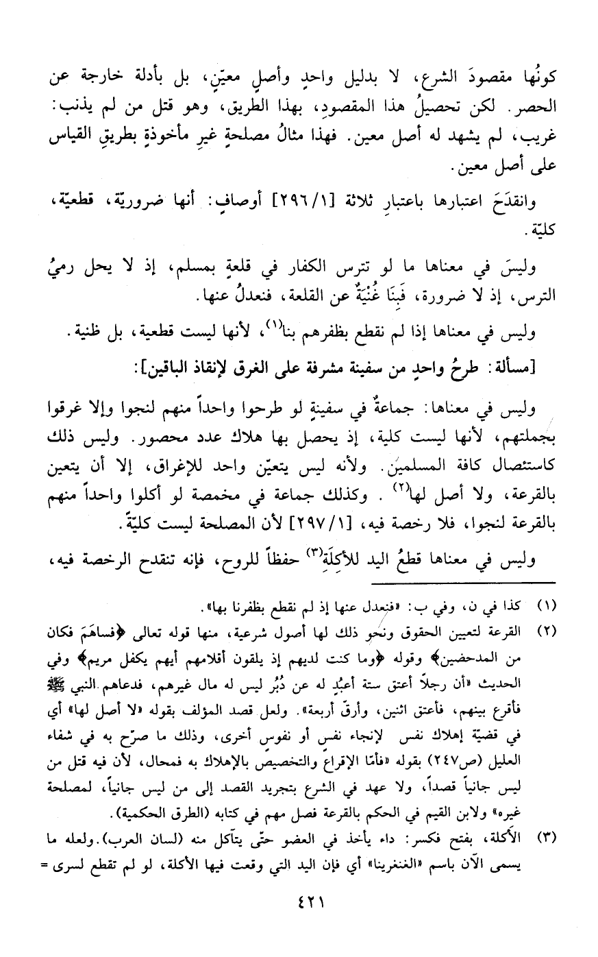وليس في معناها :جماعة في سفينة لو طرحوا واحدا منهم لنجوا وإلا غرقوا بجملتهم لأنها ليست كلية إذ يحصل بها هلاك عدد محصور وليس ذلك كاستئصال كافة المسلمين ولأنه ليس يتعين واحد للإغراق إلا أن يتعين بالقرعة ولا أصل لها وكذلك جماعة في مخمصة لو أكلوا واحدا بالقرعة لنجوا فلا رخصة فيه لأن المصلحة ليست كلية