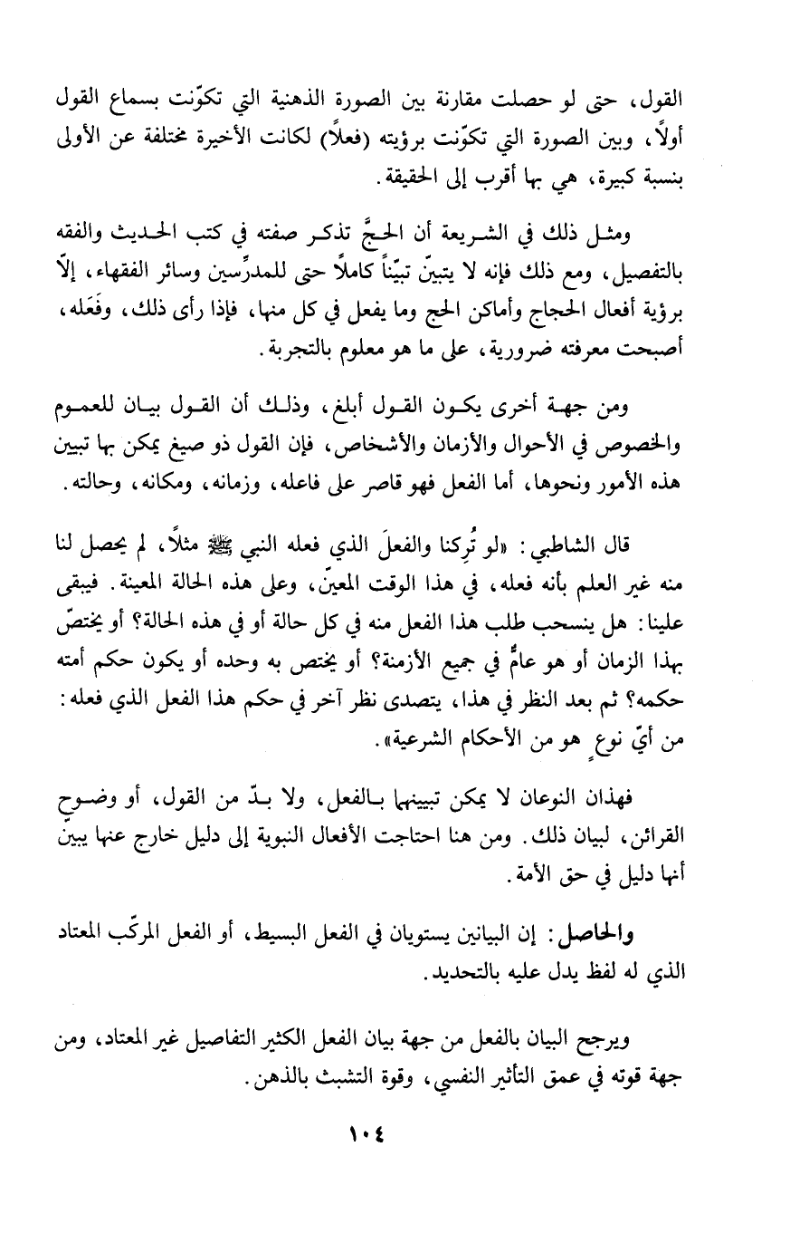 ومثل ذلك في الشريعة أن الحجَّ تذكر صفته في كتب الحديث والفقه بالتفصيل، ومع ذلك فإنه لا يتبيّن تبيناً كاملًا حتى للمدرِّسين وسائر الفقهاء، إلاّ برؤية أفعال الحجاج وأماكن الحج وما يفعل في كل منها، فإذا رأى ذلك، وفَعَله، أصبحت معرفته ضرورية، على ما هو معلوم بالتجربة.