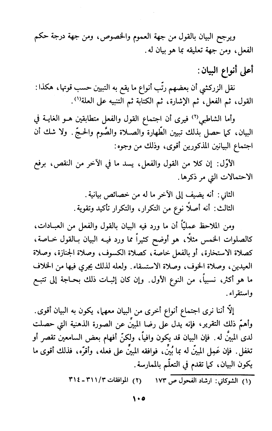 وأما الشاطبي (٢) فيرى أن اجتماع القول والفعل متطابقين هو الغاية في البيان، كما حصل بذلك تبيين الطهارة والصلاة والصَّوم والحجّ. ولا شك أن اجتماع البيانين المذكورين أقوى، وذلك من وجوه:
