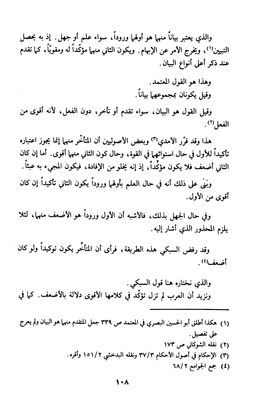 (١) هكذا أطلق أبو الحسين البصري في المعتمد ص ٣٣٩ جعل المتقدم منهما هو البيان ولم يعرج على تفصيل.