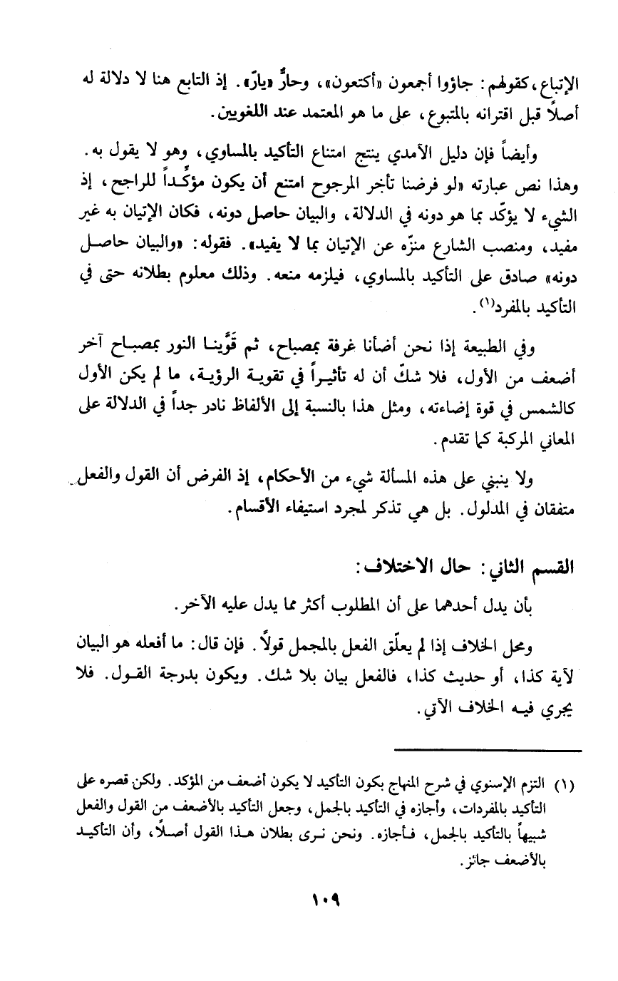 (١) التزم الإسنوي في شرح المنهاج بكون التأكيد لا يكون أضعف من المؤكد. ولكن قصره على التأكيد بالمفردات، وأجازه في التأكيد بالجمل، وجعل التأكيد بالأضعف من القول والفعل شبيهاً بالتأكيد بالجمل، فأجازه. ونحن نرى بطلان هذا القول أصلًا، وأن التأكيد بالأضعف جائز.