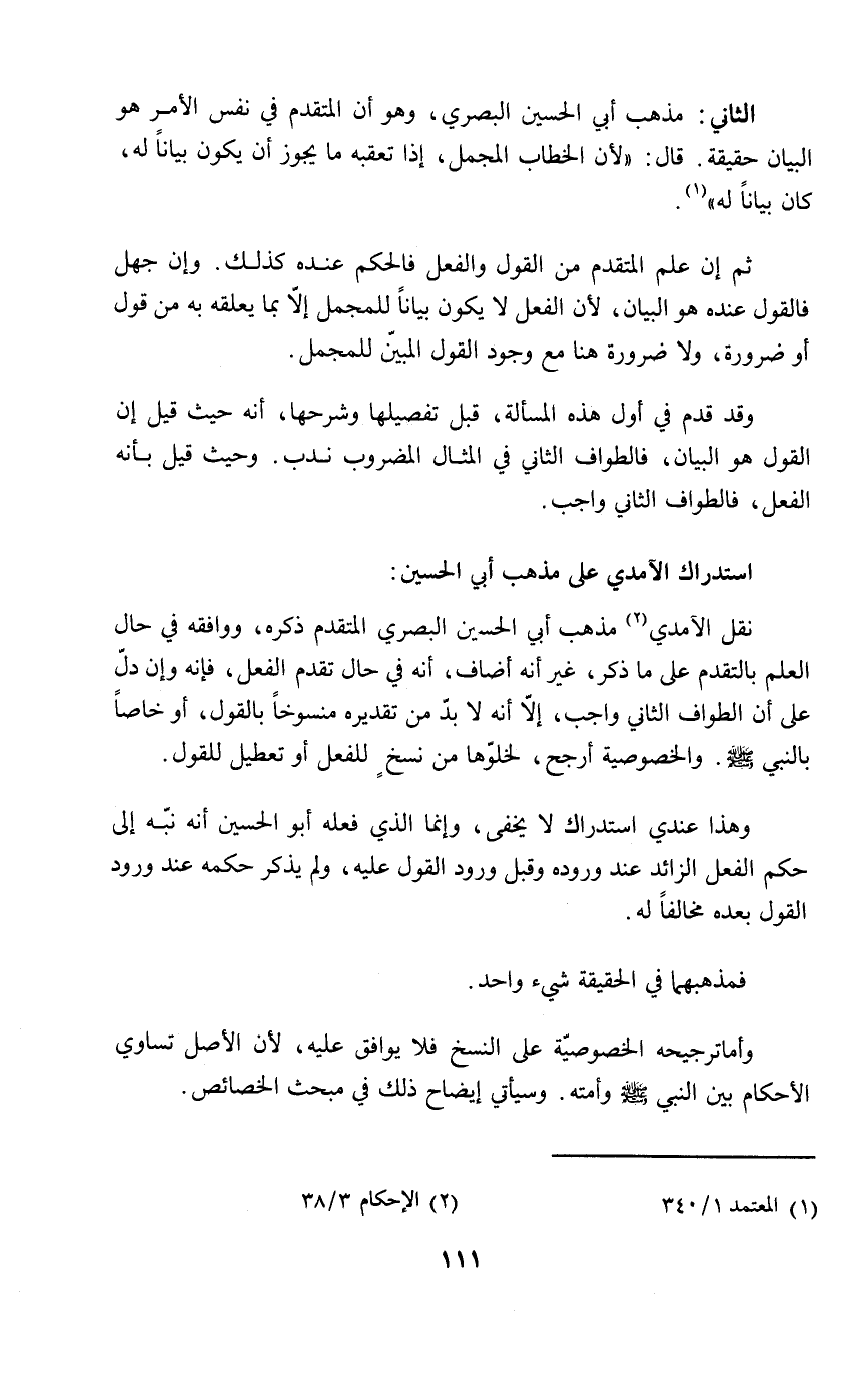 نقل الآمدي (٢) مذهب أبي الحسين البصري المتقدم ذكره، ووافقه في حال العلم بالتقدم على ما ذكر، غير أنه أضاف، أنه في حال تقدم الفعل، فإنه وإن دلّ على أن الطواف الثاني واجب، إلاّ أنه لا بدّ من تقديره منسوخاً بالقول، أو خاصاً بالنبي - صلى الله عليه وسلم -. والخصوصية أرجح، لخلوّها من نسخٍ للفعل أو تعطيل للقول.