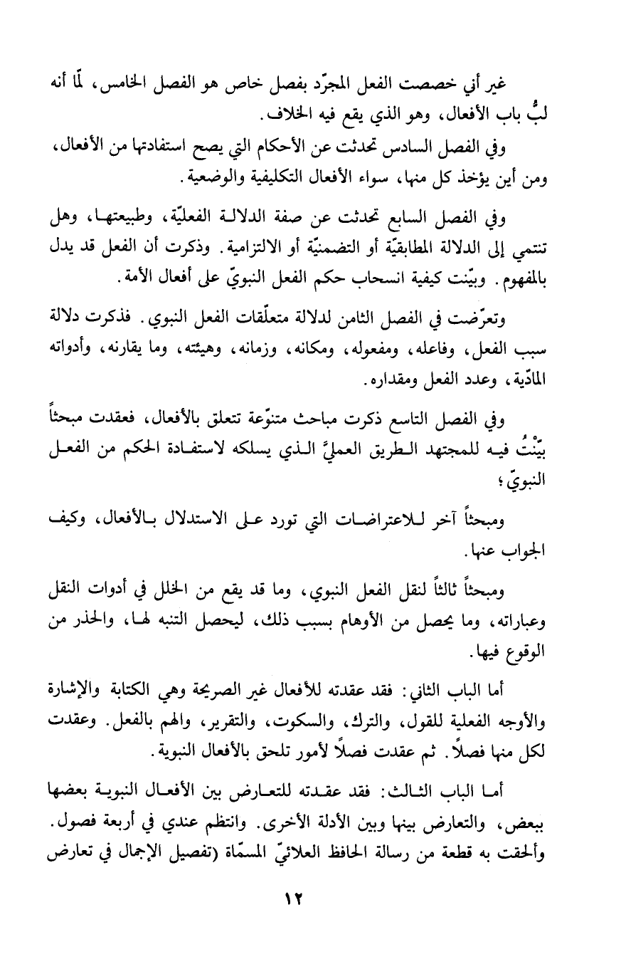 وفي الفصل التاسع ذكرت مباحث متنوّعة تتعلق بالأفعال، فعقدت مبحثاً بيّنْتُ فيه للمجتهد الطريق العمليَّ الذي يسلكه لاستفادة الحكم من الفعل النبويّ؛