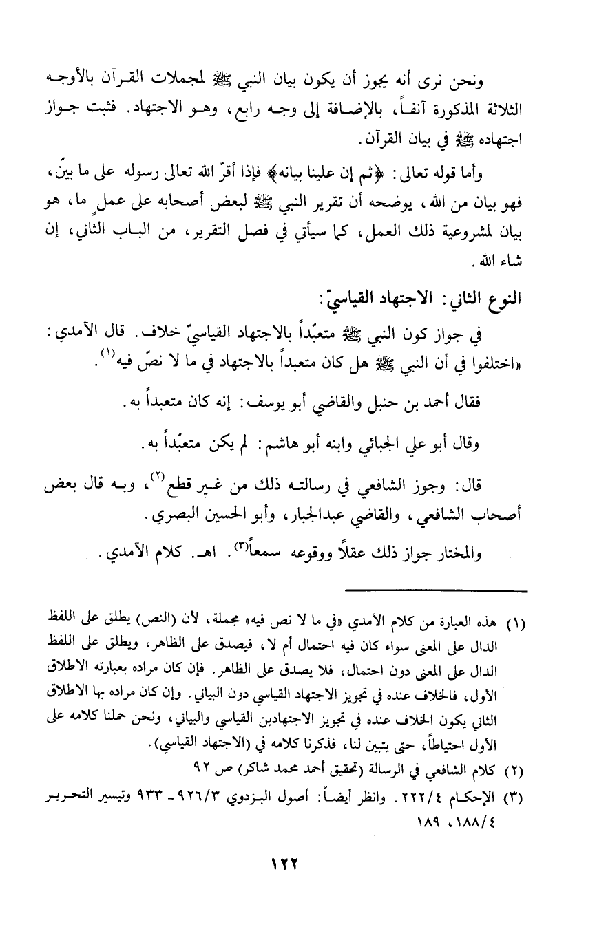 (١) هذه العبارة من كلام الآمدي "في ما لا نص فيه" مجملة، لأن (النص) يطلق على اللفظ الدال على المعنى سواء كان فيه احتمال أم لا، فيصدق على الظاهر، ويطلق على اللفظ الدال على المعنى دون احتمال، فلا يصدق على الظاهر. فإن كان مراده بعبارته الإطلاق الأول، فالخلاف عنده في تجويز الاجتهاد القياسي دون البياني. وإن كان مراده بها الإطلاق الثاني يكون الخلاف عنده في تجويز الاجتهادين القياسي والبياني، ونحن حملنا كلامه على الأول احتياطاً، حتى يتبين لنا، فذكرنا كلامه في (الاجتهاد القياسي).