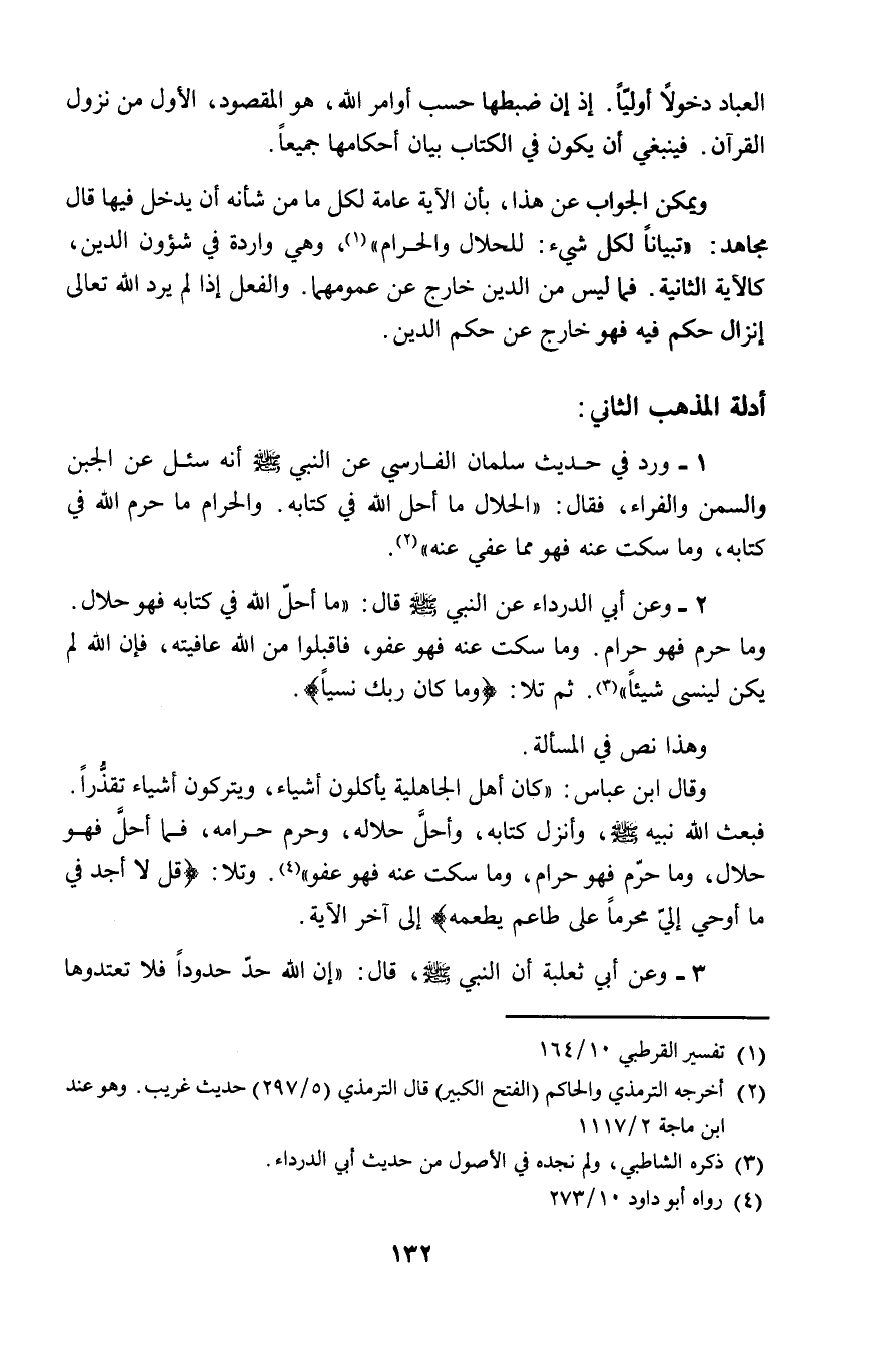 ١ - ورد في حديث سلمان الفارسي عن النبي - صلى الله عليه وسلم - أنه سئل عن الجبن والسمن والفراء، فقال: "الحلال ما أحل الله في كتابه. والحرام ما حرم الله في كتابه، وما سكت عنه فهو مما عفي عنه" (٢).