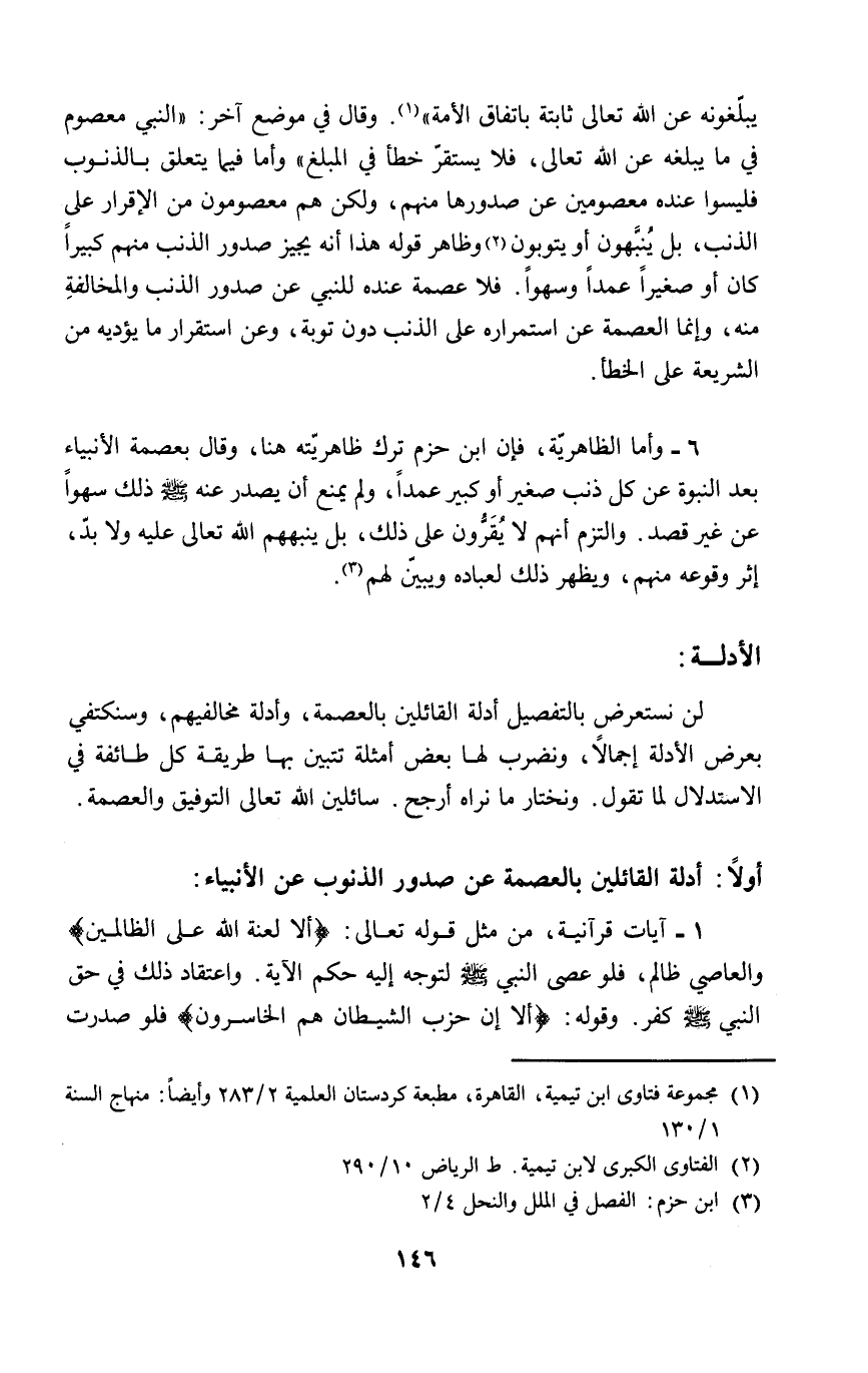 ٦ - وأما الظاهريّة، فإن ابن حزم ترك ظاهريّته هنا، وقال بعصمة الأنبياء بعد النبوة عن كل ذنب صغير أو كبير عمداً، ولم يمنع أن يصدر عنه - صلى الله عليه وسلم - ذلك سهواً عن غير قصد. والتزم أنهم لا يُقرُّون على ذلك، بل ينبههم الله تعالى عليه ولا بدّ، إثر وقوعه منهم، ويظهر ذلك لعباده ويبيّن لهم (٣).
