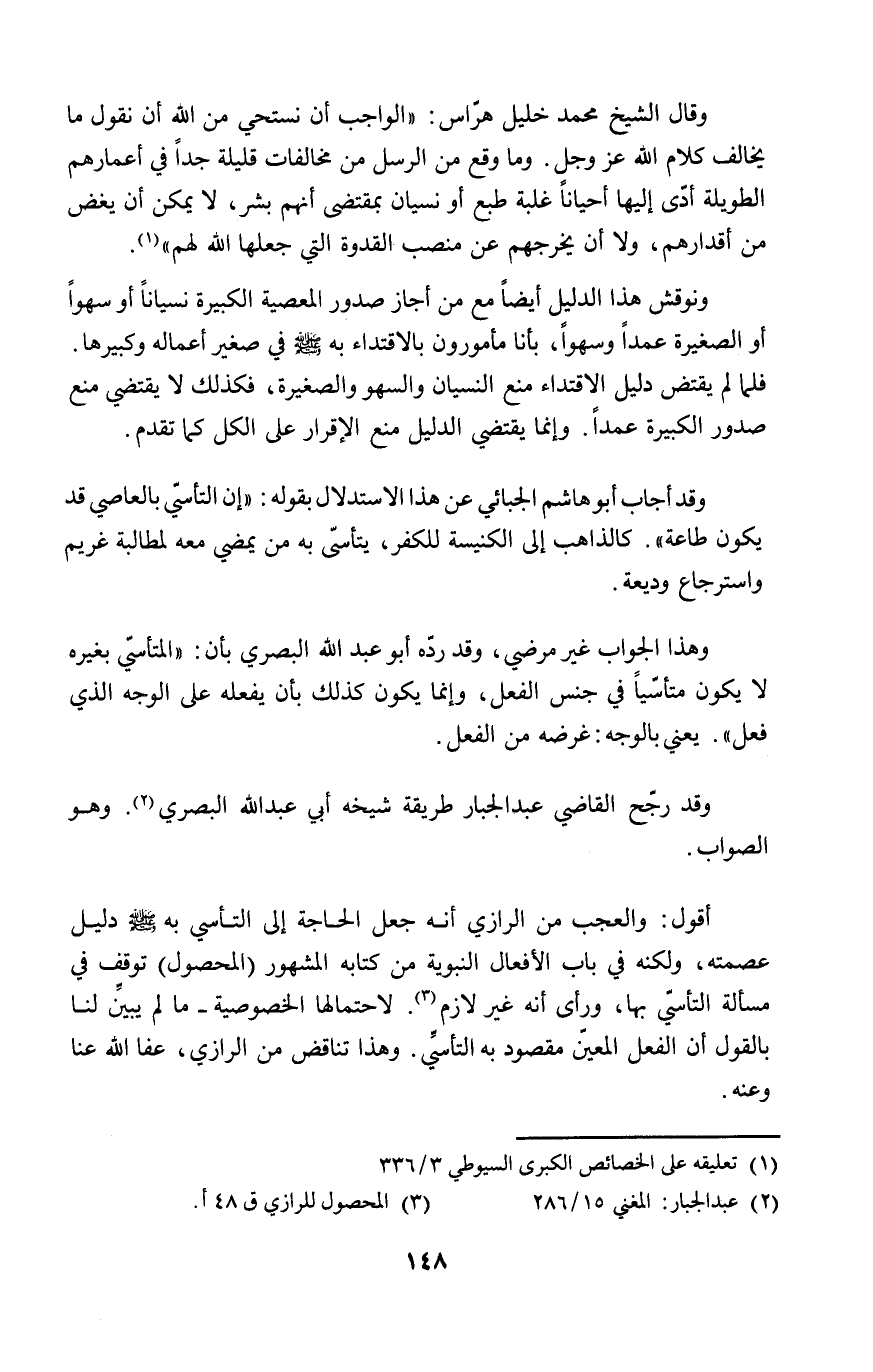 أقول: والعجب من الرازي أنه جعل الحاجة إلى التأسي به - صلى الله عليه وسلم - دليل عصمته، ولكنه في باب الأفعال النبوية من كتابه المشهور (المحصول) توقف في مسألة التأسّي بها، ورأى أنه غير لازم (٣). لاحتمالها الخصوصية - ما لم يبيِّن لنا بالقول أن الفعل المعيّن مقصود به التأسِّي. وهذا تناقض من الرازي، عفا الله عنا وعنه.