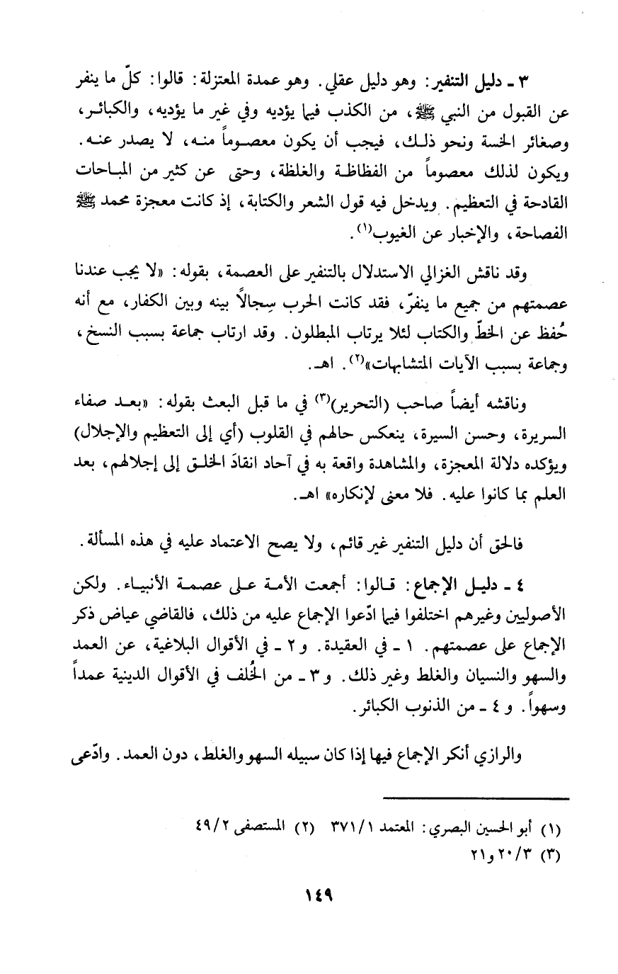 ٣ - دليل التنفير: وهو دليل عقلي. وهو عمدة المعتزلة: قالوا: كلّ ما ينفر عن القبول من النبي - صلى الله عليه وسلم -، من الكذب فيما يؤديه وفي غير ما يؤديه، والكبائر، وصغائر الخسة ونحو ذلك، فيجب أن يكون معصوماً منه، لا يصدر عنه. ويكون لذلك معصوماً من الفظاظة والغلظة، وحتى عن كثير من المباحات القادحة في التعظيم. ويدخل فيه قول الشعر والكتابة، إذ كانت معجزة محمد - صلى الله عليه وسلم - الفصاحة، والإخبار عن الغيوب (١).