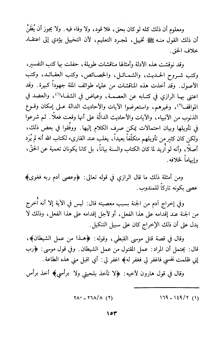 وقد نوقشت هذه الأدلة وأمثالها مناقشات طويلة، حفلت بها كتب التفسير، وكتب شروح الحديث، والشمائل، والخصائص، وكتب العقائد، وكتب الأصول. وقد أخذت هذه المناقشات من علماء طوائف الملة جهوداً كبيرة. وقد اعتنى بها الرازي في كتابه عن العصمة، وعياض في الشفاء (١)، والعضد في المواقف (٢)، وغيرهم، واستعرضوا الآيات والأحاديث الدالة على إمكان وقوع الذنوب من الأنبياء، والآيات والأحاديث الدالّة على أنها وقعت فعلاً. ثم شرعوا في تأويلها وبيان احتمالات يمكن صرف الكلام إليها. ووفِّقوا في بعض ذلك، ولكن كان كثير من تأويلهم متكلّفاً بعيداً، يغلب عند القارئ لكتاب الله أنه لم يُرَد أصلاً، وأنه لو أُريد لما كان الكتاب والسنة بياناً، بل كانا يكونان تعمية عن الحقّ، وإيهاماً لخلافه.