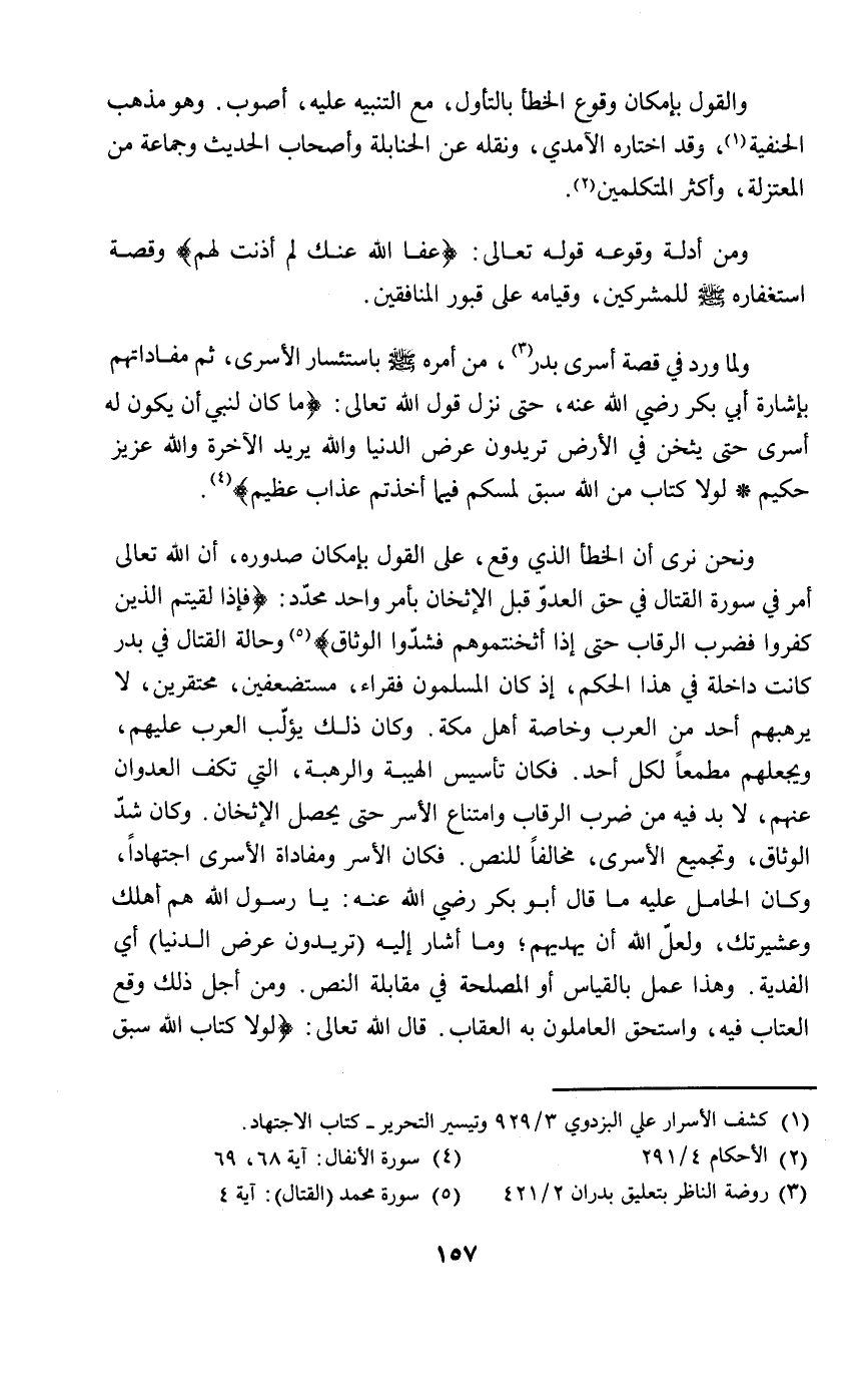 ونحن نرى أن الخطأ الذي وقع، على القول بإمكان صدوره، أن الله تعالى أمر في سورة القتال في حق العدوّ قبل الإثخان بأمر واحد محدّد: {فإذا لقيتم الذين كفروا فضرب الرقاب حتى إذا أثخنتموهم فشدّوا الوثاق} (٥) وحالة القتال في بدر كانت داخلة في هذا الحكم، إذ كان المسلمون فقراء، مستضعفين، محتقرين، لا يرهبهم أحد من العرب وخاصة أهل مكة. وكان ذلك يؤلّب العرب عليهم، ويجعلهم مطمعاً لكل أحد. فكان تأسيس الهيبة والرهبة، التي تكف العدوان عنهم، لا بد فيه من ضرب الرقاب وامتناع الأسر حتى يحصل الإثخان. وكان شدّ الوثاق، وتجميع الأسرى، مخالفاً للنص. فكان الأسر ومفاداة الأسرى اجتهاداً، وكان الحامل عليه ما قال أبو بكر رضي الله عنه: يا رسول الله هم أهلك وعشيرتك، ولعلّ الله أن يهديهم؛ وما أشار إليه (تريدون عرض الدنيا) أي الفدية. وهذا عمل بالقياس أو المصلحة في مقابلة النص. ومن أجل ذلك وقع العتاب فيه، واستحق العاملون به العقاب. قال الله تعالى: {لولا كتاب من الله سبق