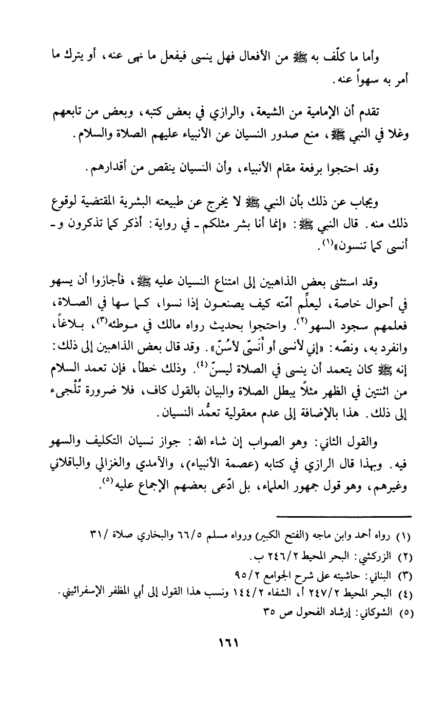 والقول الثاني: وهو الصواب إن شاء الله: جواز نسيان التكليف والسهو فيه. وبهذا قال الرازي في كتابه (عصمة الأنبياء)، والآمدي والغزالي والباقلاني وغيرهم، وهو قول جمهور العلماء، بل ادّعى بعضهم الإجماع عليه (٥).
