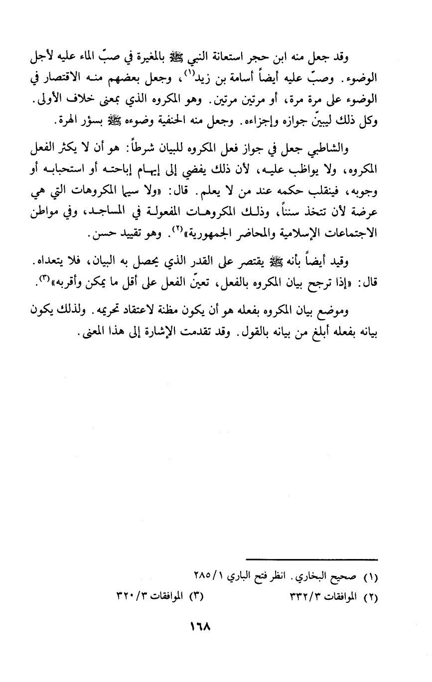والشاطبي جعل في جواز فعل المكروه للبيان شرطاً: هو أن لا يكثر الفعل المكروه، ولا يواظب عليه، لأن ذلك يفضي إلى إيهام إباحته أو استحبابه أو وجوبه، فينقلب حكمه عند من لا يعلم. قال: "ولا سيما المكروهات التي هي عرضة لأن تتخذ سنناً، وذلك المكروهات المفعولة في المساجد، وفي مواطن الاجتماعات الإسلامية والمحاضر الجمهورية" (٢). وهو تقييد حسن.