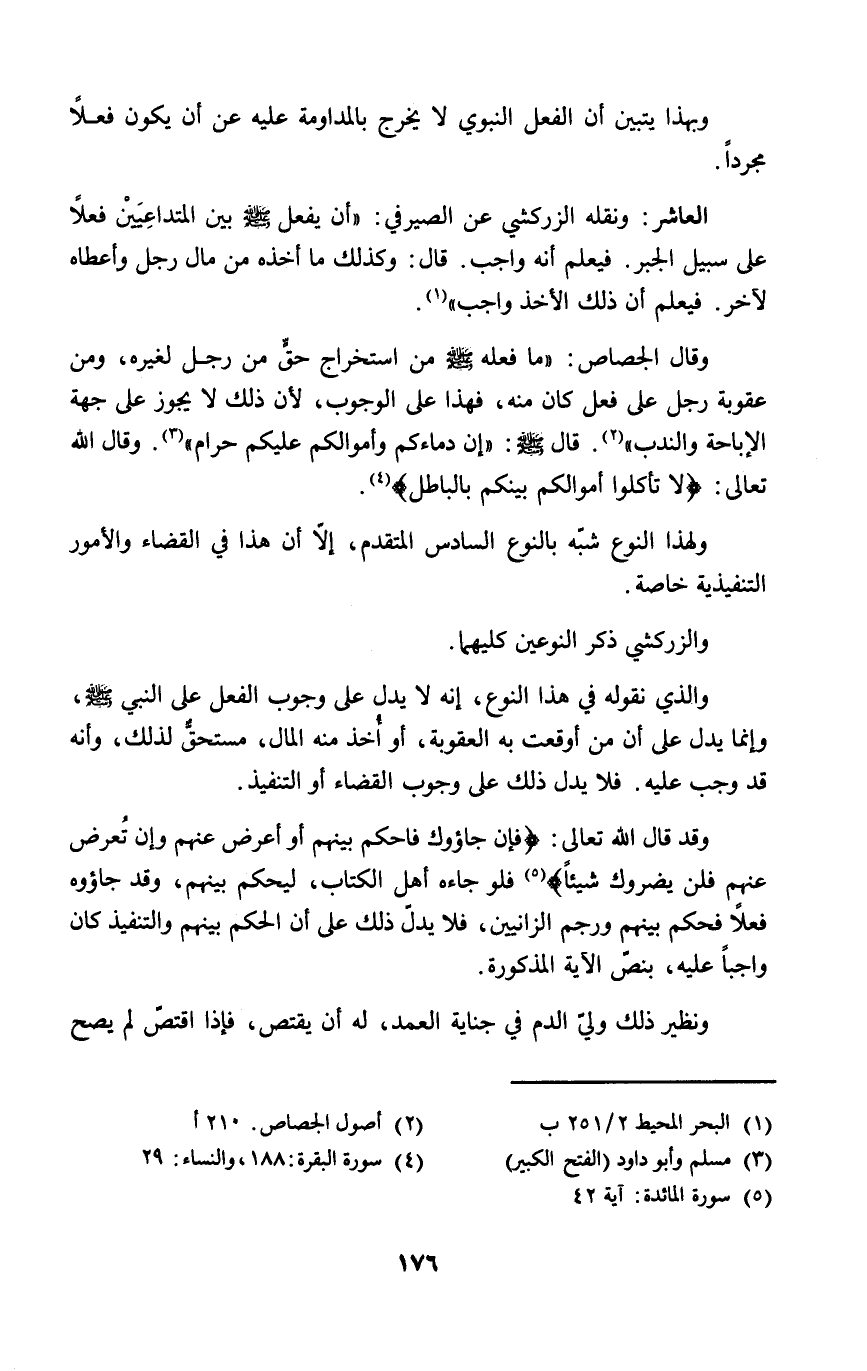 وقال الجصاص: "ما فعله - صلى الله عليه وسلم - من استخراج حقٍّ من رجل لغيره، ومن عقوبة رجل على فعل كان منه، فهذا على الوجوب، لأن ذلك لا يجوز على جهة الإباحة والندب" (٢). قال - صلى الله عليه وسلم -: "إن دماءكم وأموالكم عليكم حرام" (٣). وقال الله تعالى: {لا تأكلوا أموالكم بينكم بالباطل} (٤).