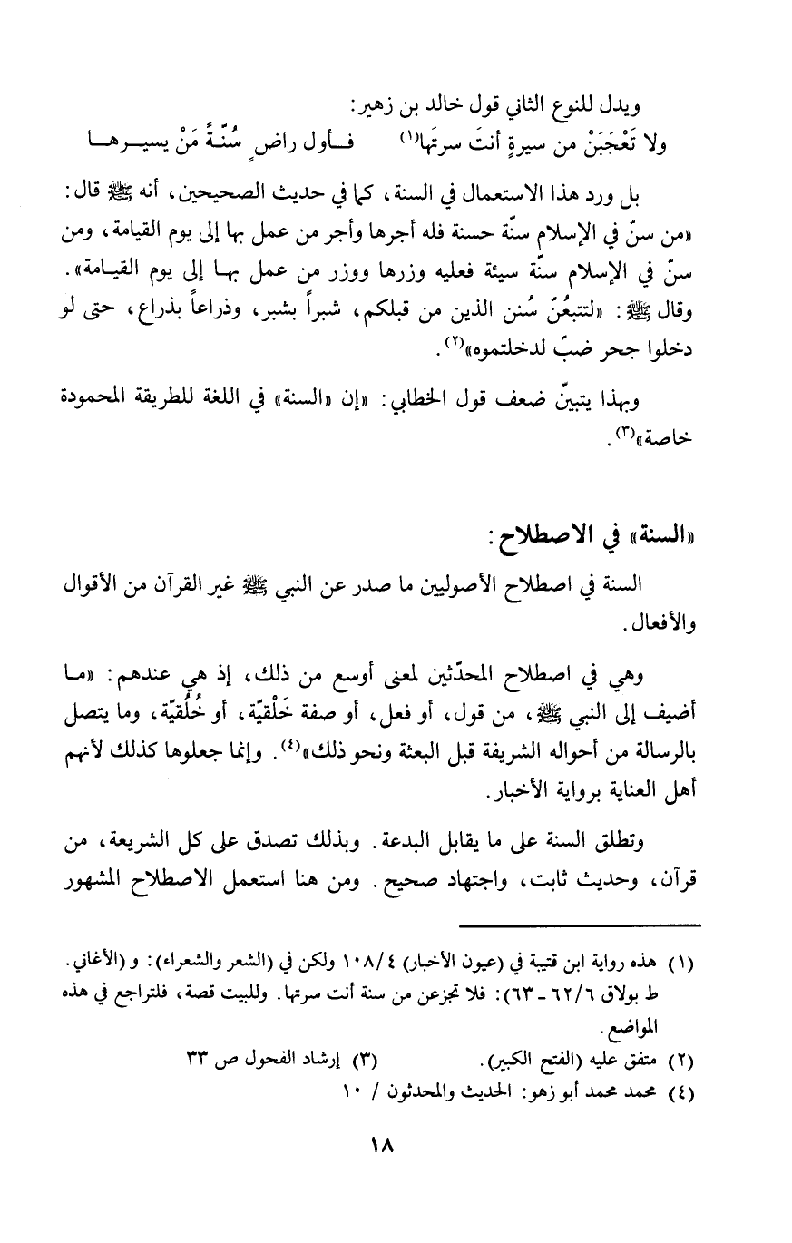 بل ورد هذا الاستعمال في السنة، كما في حديث الصحيحين، أنه - صلى الله عليه وسلم - قال: "من سنّ في الإسلام سنّة حسنة فله أجرها وأجر من عمل بها إلى يوم القيامة، ومن سنّ في الإسلام سنّة سيئة فعليه وزرها ووزر من عمل بها إلى يوم القيامة". وقال - صلى الله عليه وسلم -: "لتتبعُنّ سُنن الذين من قبلكم، شبراً بشبر، وذراعاً بذراع، حتى لو دخلوا جحر ضبّ لدخلتموه" (٢).