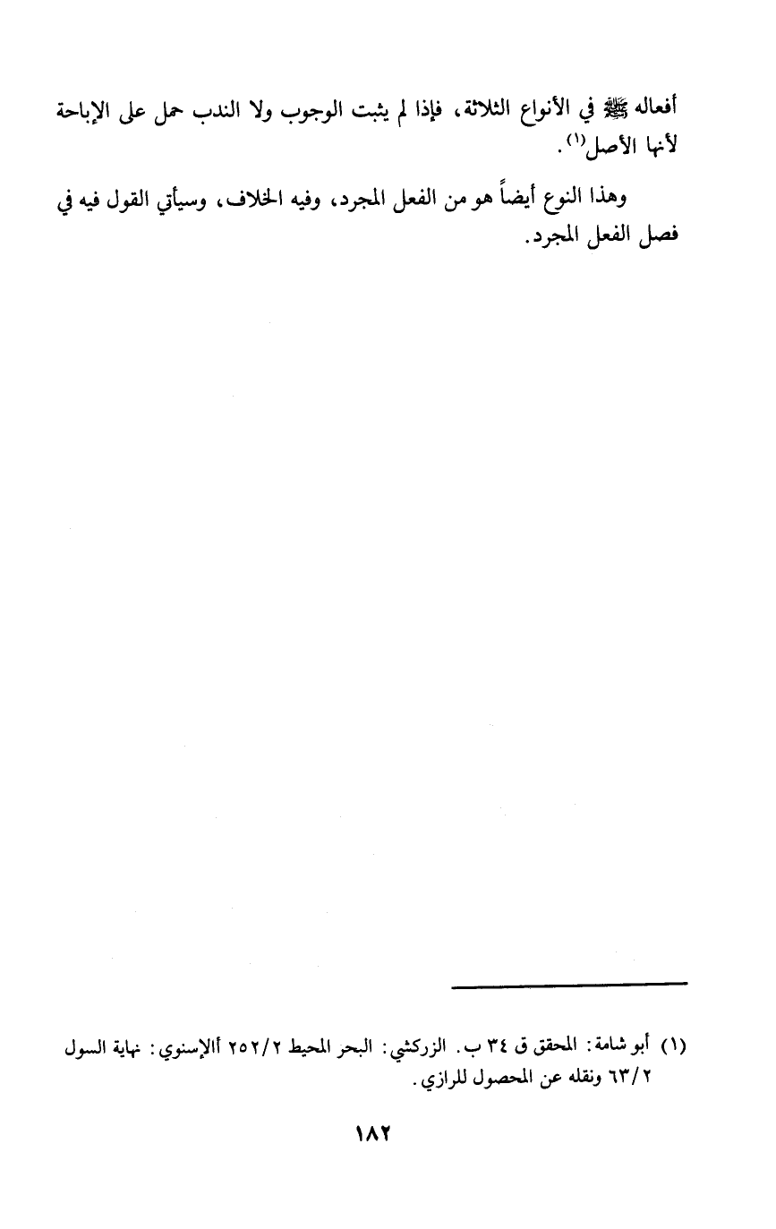 أفعاله - صلى الله عليه وسلم - في الأنواع الثلاثة، فإذا لم يثبت الوجوب ولا الندب حمل على الإباحة لأنها الأصل (١).