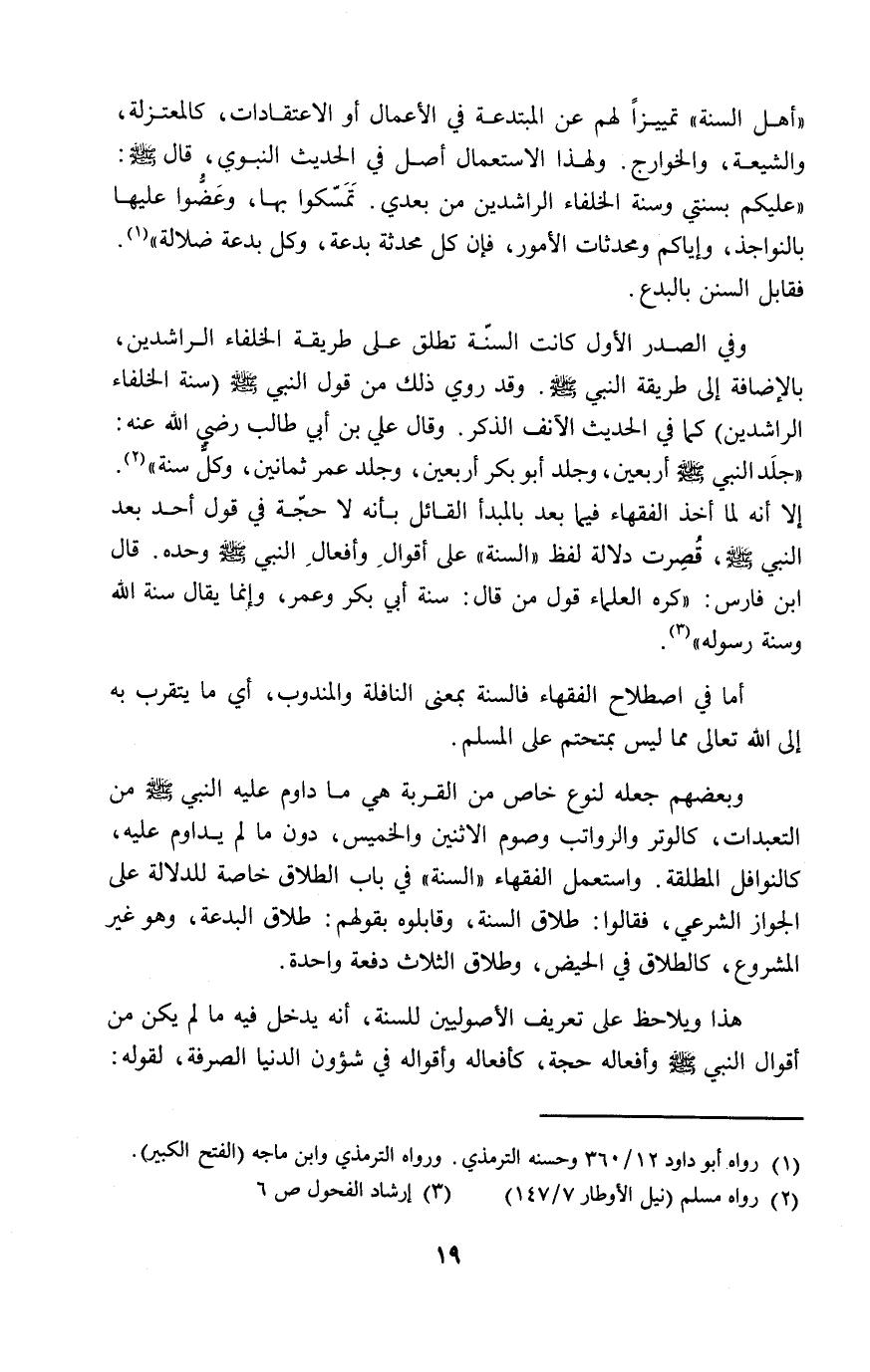 وفي الصدر الأول كانت السنّة تطلق على طريقة الخلفاء الراشدين، بالإضافة إلى طريقة النبي - صلى الله عليه وسلم -. وقد روي ذلك من قول النبي - صلى الله عليه وسلم - (سنة الخلفاء الراشدين) كما في الحديث الآنف الذكر. وقال علي بن أبي طالب رضي الله عنه: "جلَد النبي - صلى الله عليه وسلم - أربعين، وجلد أبو بكر أربعين، وجلد عمر ثمانين، وكلٌّ سنة" (٢). إلا أنه لما أخذ الفقهاء فيما بعد بالمبدأ القائل بأنه لا حجّة في قول أحد بعد النبي - صلى الله عليه وسلم -، قُصِرت دلالة لفظ "السنة" على أقوالِ وأفعالِ النبي - صلى الله عليه وسلم - وحده. قال ابن فارس: "كره العلماء قول من قال: سنة أبي بكر وعمر، وإنما يقال سنة الله وسنة رسوله" (٣).