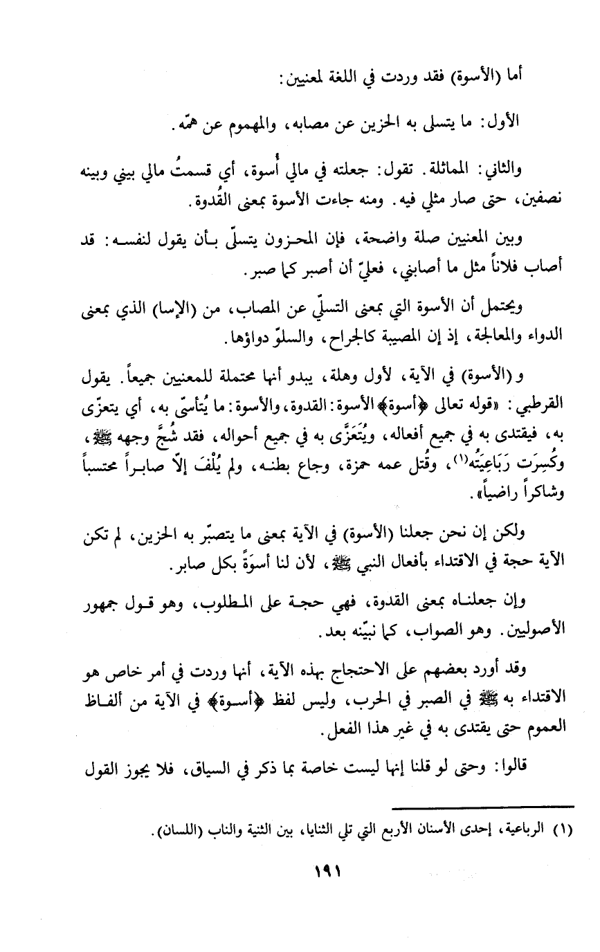 ولكن إن نحن جعلنا (الأسوة) في الآية بمعنى ما يتصبّر به الحزين، لم تكن الآية حجة في الاقتداء بأفعال النبي - صلى الله عليه وسلم -، لأن لنا أسوَةً بكل صابر.