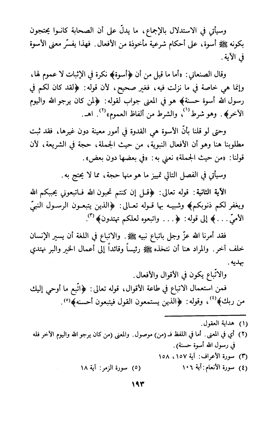 وسيأتي في الاستدلال بالإجماع، ما يدلّ على أن الصحابة كانوا يحتجون بكونه - صلى الله عليه وسلم - أسوة، على أحكام شرعية مأخوذة من الأفعال. فهذا يفسّر معنى الأسوة في الآية.