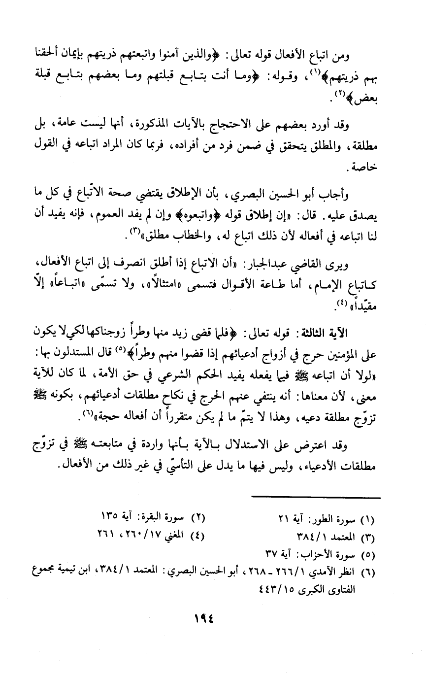 ويرى القاضي عبد الجبار: "أن الاتباع إذا أطلق انصرف إلى اتباع الأفعال، كاتباع الإمام، أما طاعة الأقوال فتسمى "امتثالاً"، ولا تسمّى "اتباعاً" إلاّ مقيّداً" (٤).