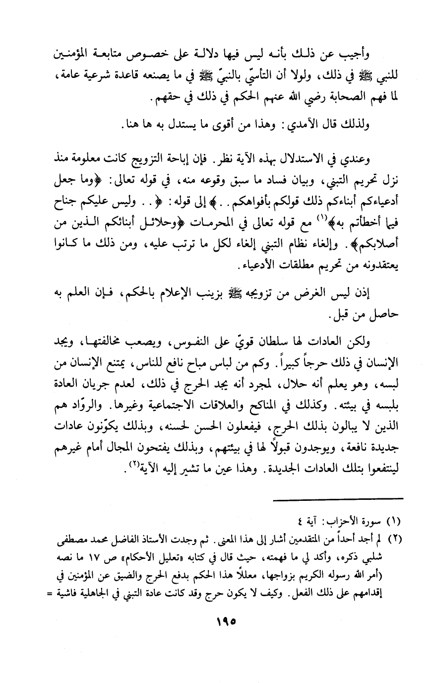 (٢) لم أجد أحداً من المتقدمين أشار إلى هذا المعنى. ثم وجدت الأستاذ الفاضل محمد مصطفى شلبي ذكره، وأكد لي ما فهمته، حيث قال في كتابه "تعليل الأحكام" ص ١٧ ما نصه (أمر الله رسوله الكريم بزواجها، معللاً هذا الحكم بدفع الحرج والضيق عن المؤمنين في إقدامهم على ذلك الفعل. وكيف لا يكون حرج وقد كانت عادة التبني في الجاهلية فاشية =