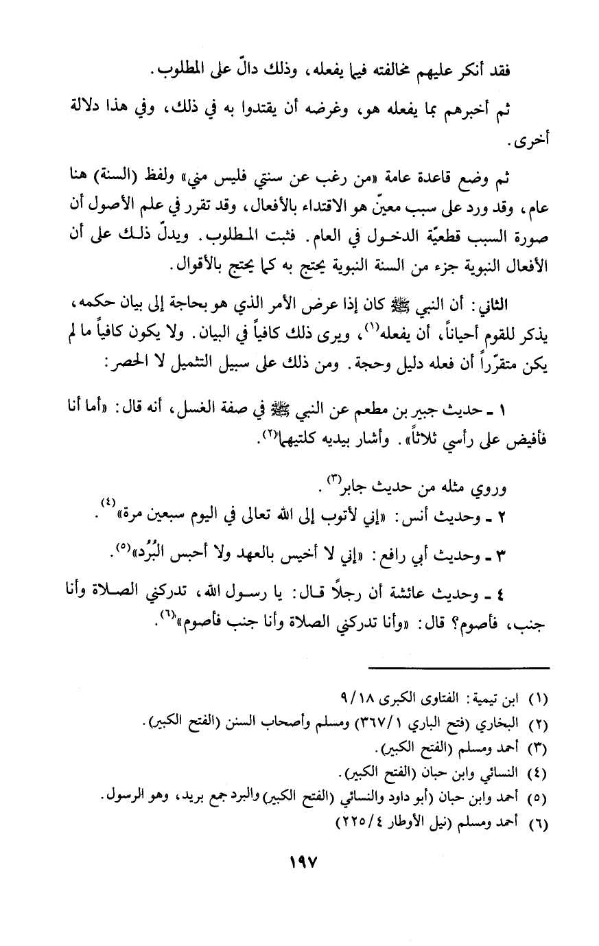 ثم وضع قاعدة عامة "من رغب عن سنتي فليس مني" ولفظ (السنة) هنا عام، وقد ورد على سبب معين هو الاقتداء بالأفعال، وقد تقرر في علم الأصول أن صورة السبب قطعيّة الدخول في العام. فثبت المطلوب. ويدلّ ذلك على أن الأفعال النبوية جزء من السنة النبوية يحتج به كما يحتج بالأقوال.