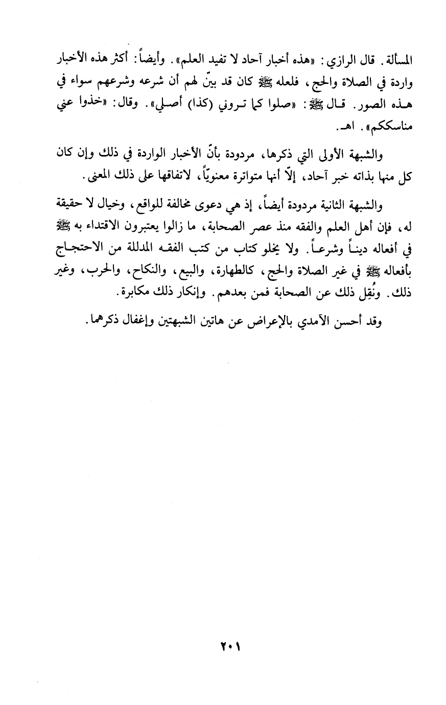 المسألة. قال الرازي: "هذه أخبار آحاد لا تفيد العلم". وأيضاً: أكثر هذه الأخبار واردة في الصلاة والحج، فلعله - صلى الله عليه وسلم - كان قد بيّن لهم أن شرعه وشرعهم سواء في هذه الصور. قال - صلى الله عليه وسلم -: "صلوا كما تروني (كذا) أصلي". وقال: "خذوا عني مناسككم". اهـ.