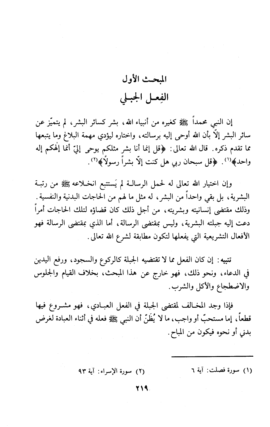 وإن اختيار الله تعالى له لحمل الرسالة لم يَستتبع انخلاعه - صلى الله عليه وسلم - من رتبة البشرية، بل بقي واحداً من البشر، له مثل ما لهم من الحاجات البدنية والنفسية. وذلك مقتضى إنسانيته وبشريته، من أجل ذلك كان قضاؤه لتلك الحاجات أمراً دعت إليه جبلته البشرية، وليس بمقتضى الرسالة، أما الذي بمقتضى الرسالة فهو الأفعال التشريعية التي يفعلها لتكون مطابقة لشرع الله تعالى.