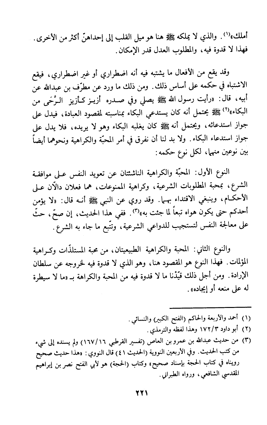 وقد يقع من الأفعال ما يشتبه فيه أنه اضطراري أو غير اضطراري، فيقع الاشتباه في حكمه على أساس ذلك. ومن ذلك ما ورد عن مطرّف بن عبد الله عن أبيه، قال: "رأيت رسول الله - صلى الله عليه وسلم - يصلي وفي صدره أزيز كأزيز الرَّحَى من البكاء" (٢) - صلى الله عليه وسلم - يحتمل أنه كان يستدعي البكاء بمناسبته لمقصود العبادة، فيدل على جواز استدعائه، ويحتمل أنه - صلى الله عليه وسلم - كان يغلبه البكاء وهو لا يريده، فلا يدل على جواز استدعاء البكاء. ولا بد لنا أن نفرق في أمر المحبّة والكراهية ونحوهما أيضاً بين نوعين منهما، لكل نوع حكمه:
