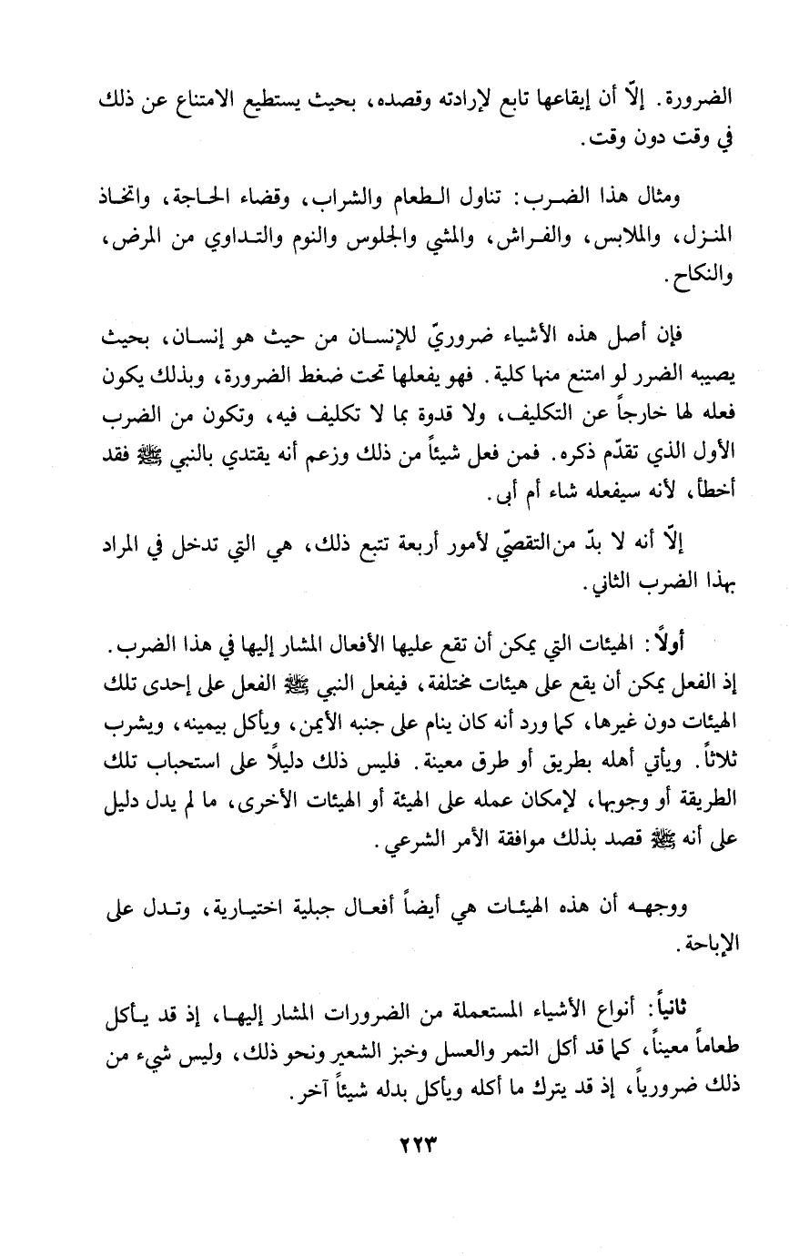 فإن أصل هذه الأشياء ضروريّ للإنسان من حيث هو إنسان، بحيث يصيبه الضرر لو امتنع منها كلية. فهو يفعلها تحت ضغط الضرورة، وبذلك يكون فعله لها خارجاً عن التكليف، ولا قدوة بما لا تكليف فيه، وتكون من الضرب الأول الذي تقدّم ذكره. فمن فعل شيئاً من ذلك وزعم أنه يقتدي بالنبي - صلى الله عليه وسلم - فقد أخطأ، لأنه سيفعله شاء أم أبى.