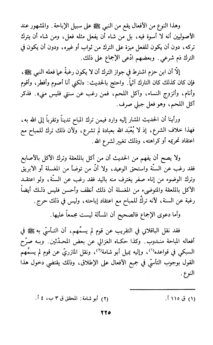 إلاّ أن ابن حزم اشترط في جواز الترك أن لا يكون رغبةً عما فعله النبي - صلى الله عليه وسلم -، فإن كان كذلك كان التارك آثماً. واحتج بالحديث: "لكني أنا أصوم وأفطر، وأقوم وأنام، وأتزوج النساء، وآكل اللحم، فمن رغب عن سنتي فليس مني". فذكر أكل اللحم، وهو فعل جبلي صرف.
