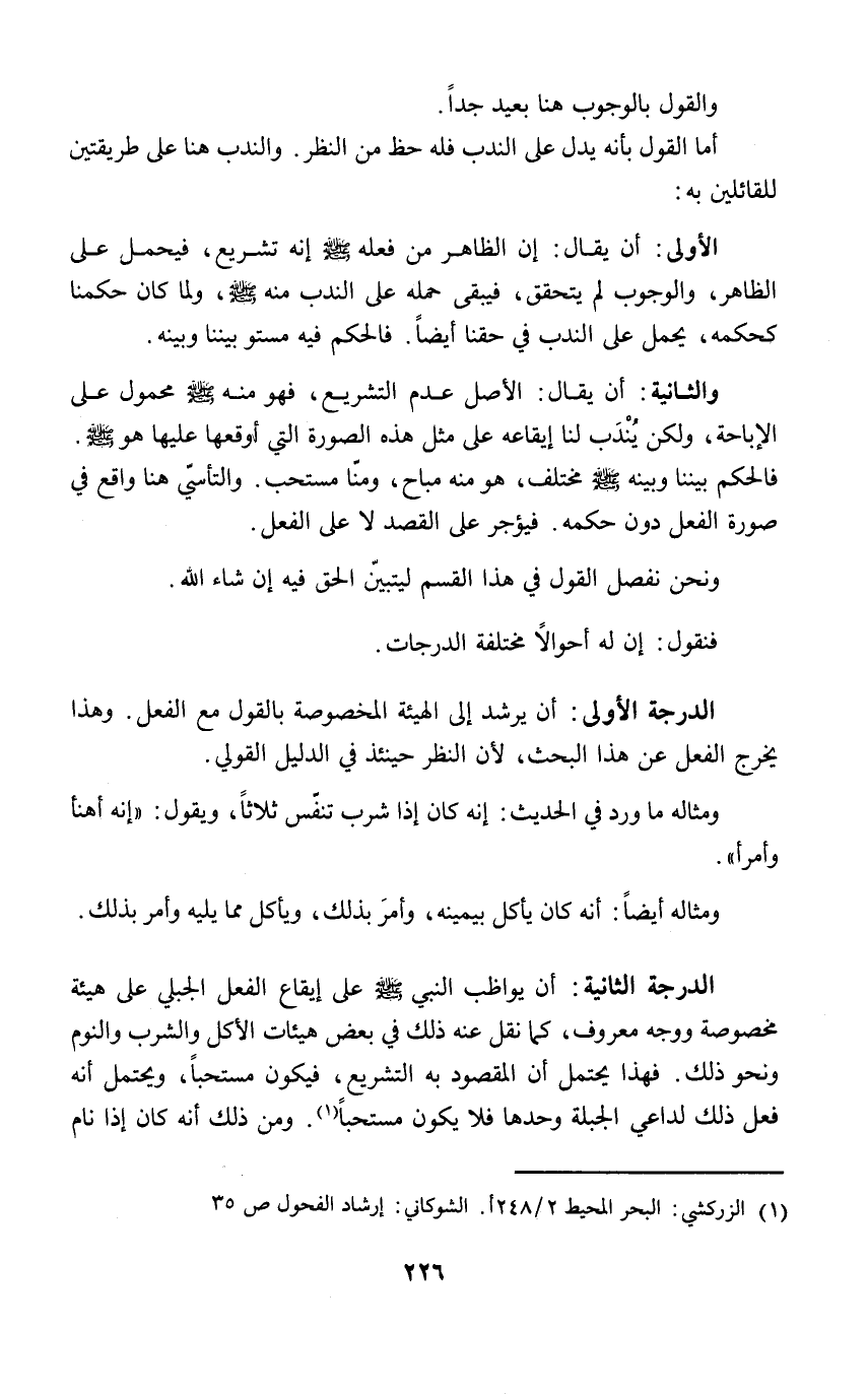 الدرجة الثانية: أن يواظب النبي - صلى الله عليه وسلم - على إيقاع الفعل الجبلي على هيئة مخصوصة ووجه معروف، كما نقل عنه ذلك في بعض هيئات الأكل والشرب والنوم ونحو ذلك. فهذا يحتمل أن المقصود به التشريع، فيكون مستحباً، ويحتمل أنه فعل ذلك لداعي الجبلة وحدها فلا يكون مستحباً (١). ومن ذلك أنه كان إذا نام