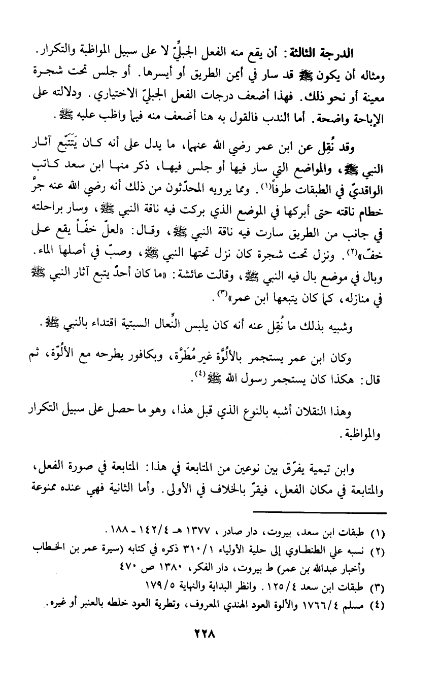 وقد نُقِل عن ابن عمر رضي الله عنهما، ما يدل على أنه كان يَتَتَبّع آثار النبي - صلى الله عليه وسلم -، والمواضع التي سار فيها أو جلس فيها، ذكر منها ابن سعد كاتب الواقديّ في الطبقات طرفاً (١). ومما يرويه المحدّثون من ذلك أنه رضي الله عنه جرّ خطام ناقته حتى أبركها في الموضع الذي بركت فيه ناقة النبي - صلى الله عليه وسلم -، وسار براحلته في جانب من الطريق سارت فيه ناقة النبي - صلى الله عليه وسلم -، وقال: "لعلّ خفاً يقع على خفّ" (٢). ونزل تحت شجرة كان نزل تحتها النبي - صلى الله عليه وسلم -، وصحث في أصلها الماء. وبال في موضع بال فيه النبي - صلى الله عليه وسلم -، وقالت عائشة: "ما كان أحدٌ يتبع آثار النبي - صلى الله عليه وسلم - في منازله، كما كان يتبعها ابن عمر" (٣).
