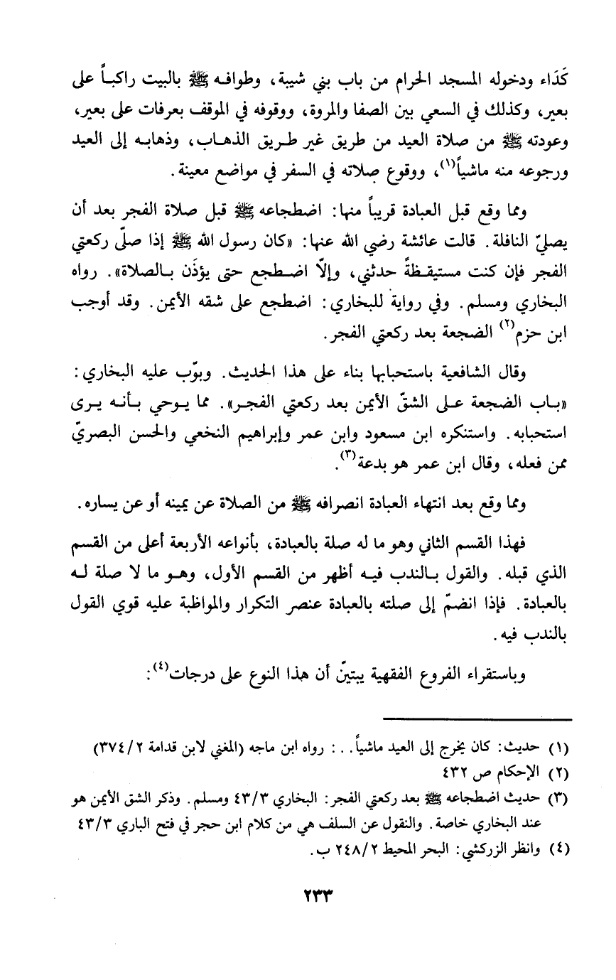 (٣) حديث اضطجاعه - صلى الله عليه وسلم - بعد ركعتي الفجر: البخاري ٣/ ٤٣ ومسلم. وذكر الشق الأيمن هو عند البخاري خاصة. والنقول عن السلف - صلى الله عليه وسلم - من كلام ابن حجر في فتح الباري ٣/ ٤٣