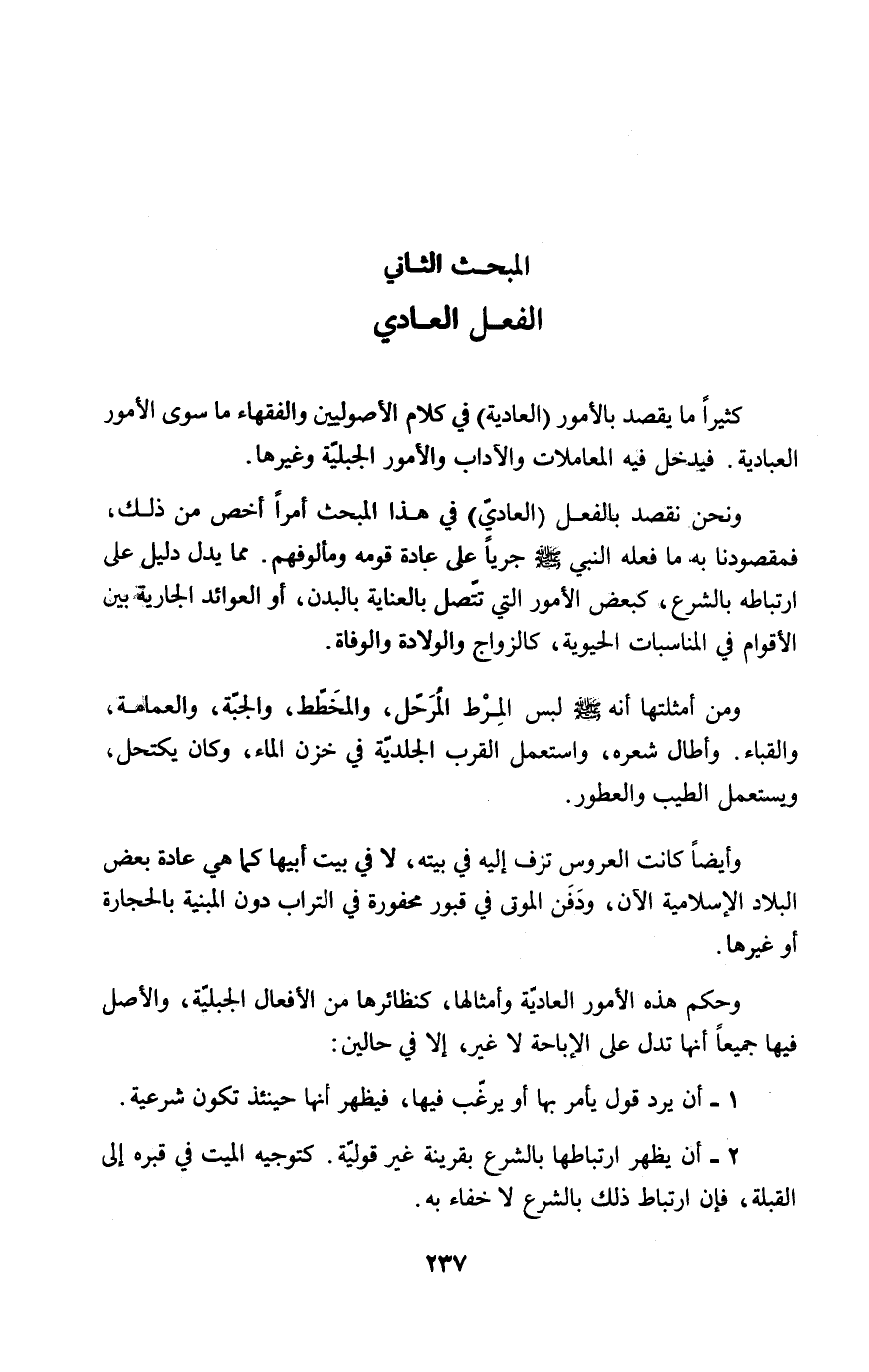 ونحن نقصد بالفعل (العاديّ) في هذا المبحث أمراً أخص من ذلك، فمقصودنا به ما فعله النبي - صلى الله عليه وسلم - جرياً على عادة قومه ومألوفهم. مما يدل دليل على ارتباطه بالشرع، كبعض الأمور التي تتصل بالعناية بالبدن، أو العوائد الجارية بين الأقوام في المناسبات الحيوية، كالزواج والولادة والوفاة.