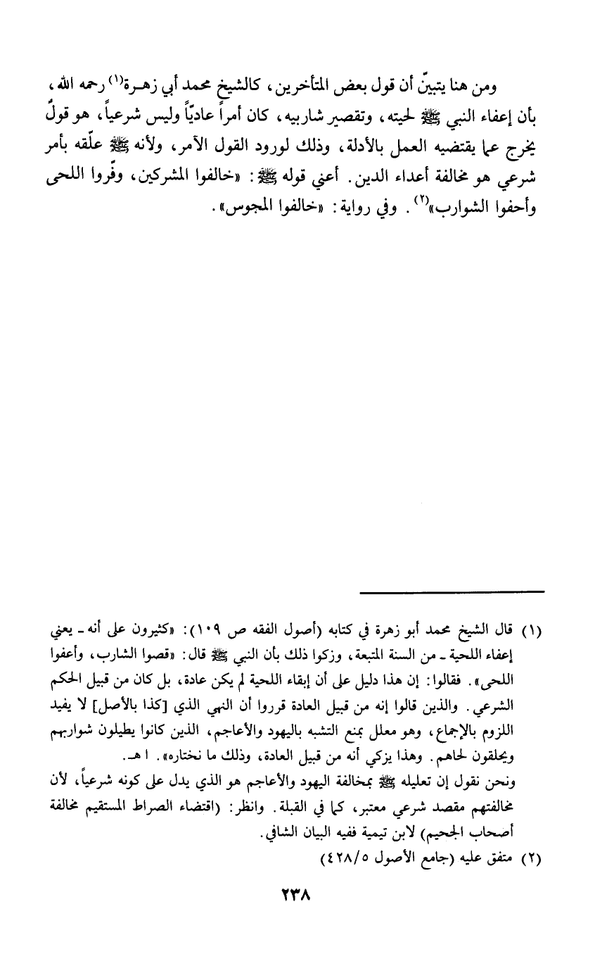 (١) قال الشيخ محمد أبو زهرة في كتابه (أصول الفقه ص ١٠٩): "كثيرون على أنه -يعني إعفاء اللحية- من السنة المتبعة، وزكوا ذلك بأن النبي - صلى الله عليه وسلم - قال: "قصوا الشارب، وأعفوا اللحى". فقالوا: إن هذا دليل على أن إبقاء اللحية لم يكن عادة، بل كان من قبيل الحكم الشرعي. والذين قالوا إنه من قبيل العادة قرروا أن النهي الذي [كذا بالأصل] لا يفيد اللزوم بالإجماع، وهو معلل بمنع التشبه باليهود والأعاجم، الذين كانوا يطيلون شواربهم ويحلقون لحاهم. وهذا يزكي أنه من قبيل العادة، وذلك ما نختاره". اهـ.