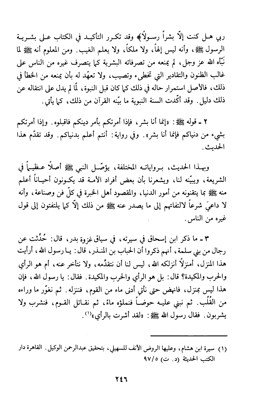٣ - ما ذكر ابن إسحاق في سيرته، في سياق غزوة بدر، قال: حُدِّثت عن رجال من بني سلمة، أنهم ذكروا أن الحباب بن المنذر، قال: يا رسول الله، أرأيت هذا المنزل، أمنزلاً أنزلكه الله، ليس لنا أن نتقدَّمه، ولا نتأخر عنه، أم هو الرأي والحرب والمكيدة؟ قال: بل هو الرأي والحرب والمكيدة. فقال: يا رسول الله، فإن هذا ليس بمنزل، فانهض حتى نأتي أدنى ماء من القوم، فننزله. ثم نغوّر ما وراءه من القُلُب. ثم نبني عليه حوضاً فنملؤه ماءً، ثم نقاتل القوم، فنشرب ولا يشربون. فقال رسول الله - صلى الله عليه وسلم -: "لقد أشرت بالرأي" (١).