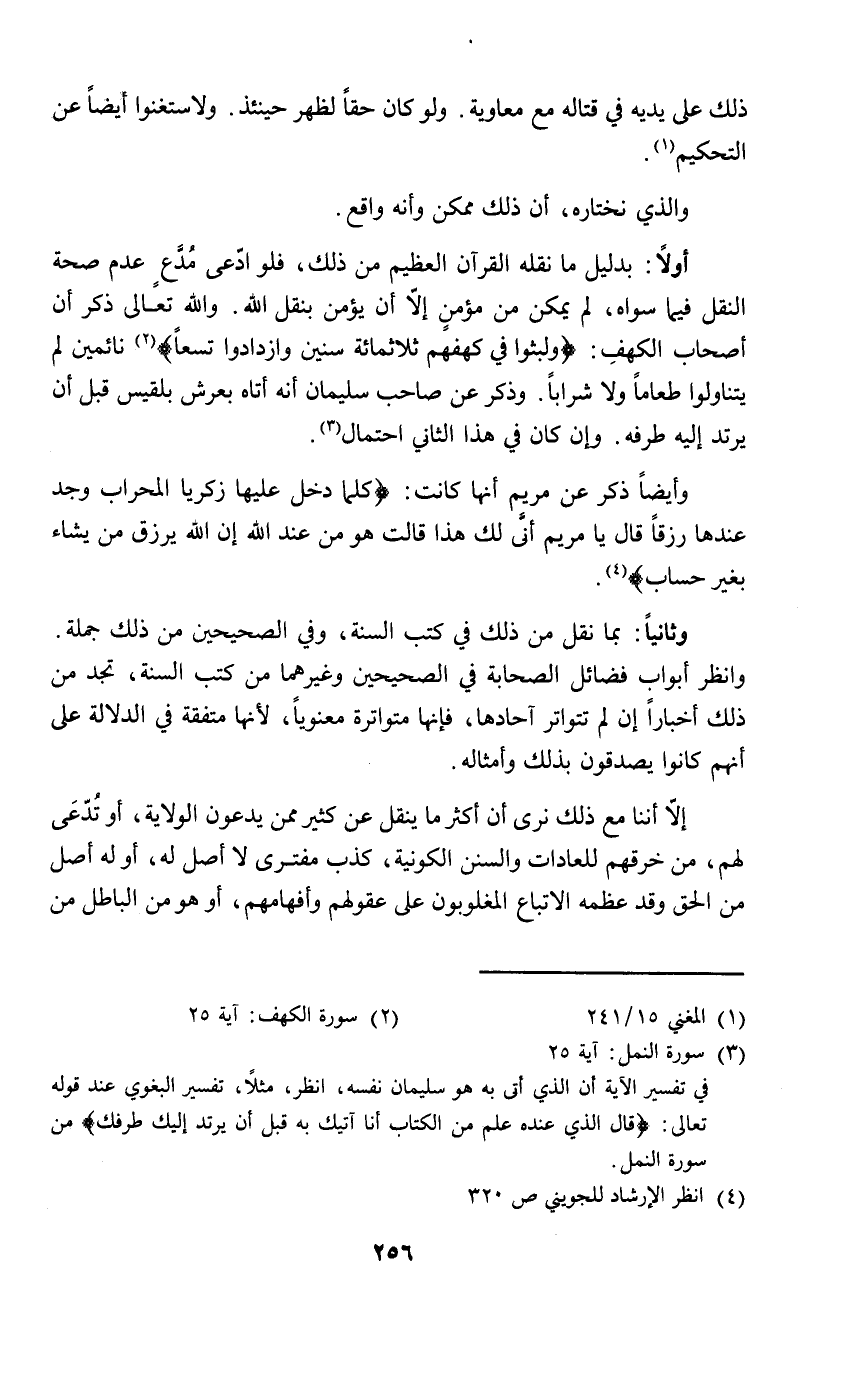 أولاً: بدليل ما نقله القرآن العظيم من ذلك، فلو ادّعى مُدَّعٍ عدم صحة النقل فيما سواه، لم يمكن من مؤمنٍ إلا أن يؤمن بنقل الله. والله تعالى ذكر أن أصحاب الكهفِ: {ولبثوا في كهفهم ثلاثمائة سنين وازدادوا تسعاً} (٢) نائمين لم يتناولوا طعاماً ولا شراباً. وذكر عن صاحب سليمان أنه أتاه بعرش بلقيس قبل أن يرتد إليه طرفه. وإن كان في هذا الثاني احتمال (٣).