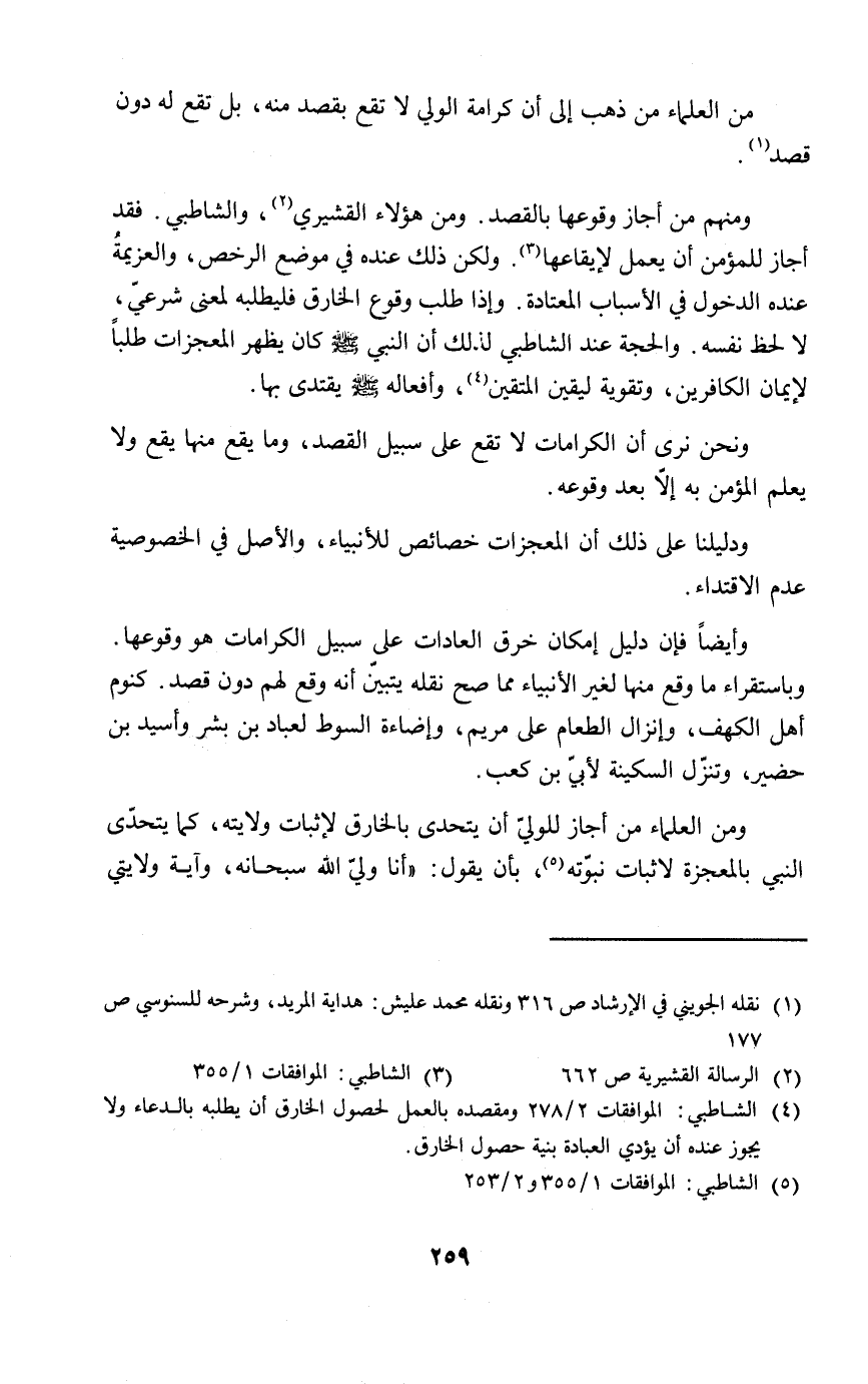 ومنهم من أجاز وقوعها بالقصد. ومن هؤلاء القشيري (٢)، والشاطبي. فقد أجاز للمؤمن أن يعمل لإيقاعها (٣). ولكن ذلك عنده في موضع الرخص، والعزيمةُ عنده الدخول في الأسباب المعتادة. وإذا طلب وقوع الخارق فليطلبه لمعنى شرعيّ، لا لحظ نفسه. والحجة عند الشاطبي ذلك أن النبي - صلى الله عليه وسلم - كان يظهر المعجزات طلباً لإيمان الكافرين، وتقوية ليقين المتقين (٤)، وأفعاله - صلى الله عليه وسلم - يقتدى بها.