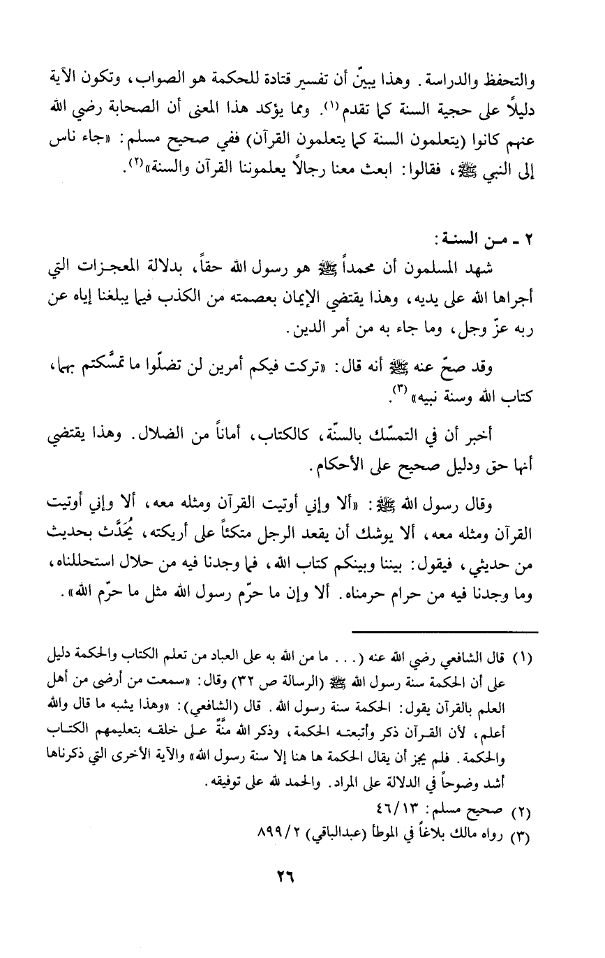 وقد صحّ عنه - صلى الله عليه وسلم - أنه قال: "تركت فيكم أمرين لن تضلّوا ما تمسَّكتم بهما، كتاب الله وسنة نبيه" (٣).