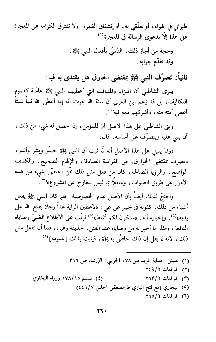 "ومما ينبني على هذا الأصل أنه لما ثبت أن النبي - صلى الله عليه وسلم - حذّر وبشّر وأنذر، وتصرف بمقتضى الخوارق، من الفراسة الصادقة، والإلهام الصحيح، والكشف الواضح، والرؤيا الصالحة، كان من فعل مثل ذلك ممّن اختصّ بشيء من هذه الأمور على طريق الصواب، وعاملاً بما ليس بخارج عن المشروع" (٣).