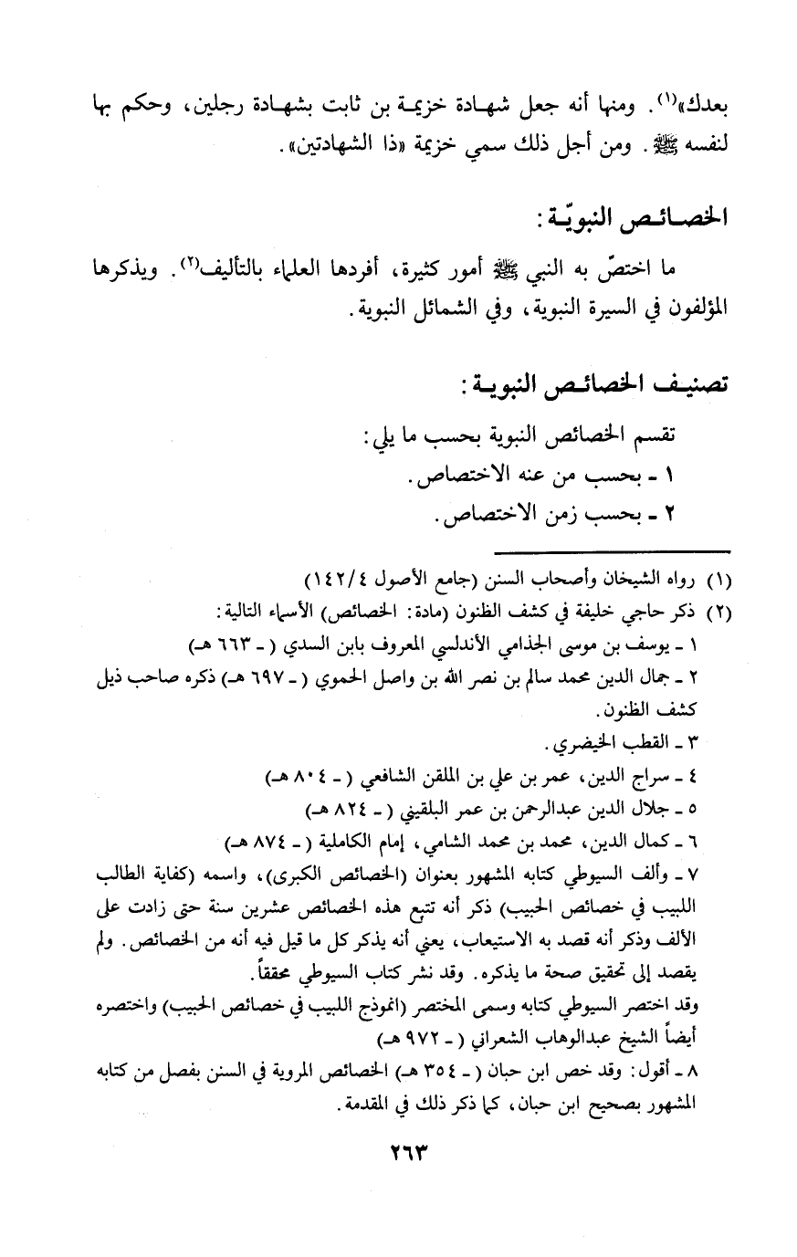 ٧ - وألف السيوطي كتابه المشهور بعنوان (الخصائص الكبرى)، واسمه (كفاية الطالب اللبيب في خصائص الحبيب) ذكر أنه تتبع هذه الخصائص عشرين سنة حتى زادت على الألف وذكر أنه قصد به الاستيعاب، يعني أنه يذكر كل ما قيل فيه أنه من الخصائص. ولم يقصد إلى تحقيق صحة ما يذكره. وقد نشر كتاب السيوطي محققاً.