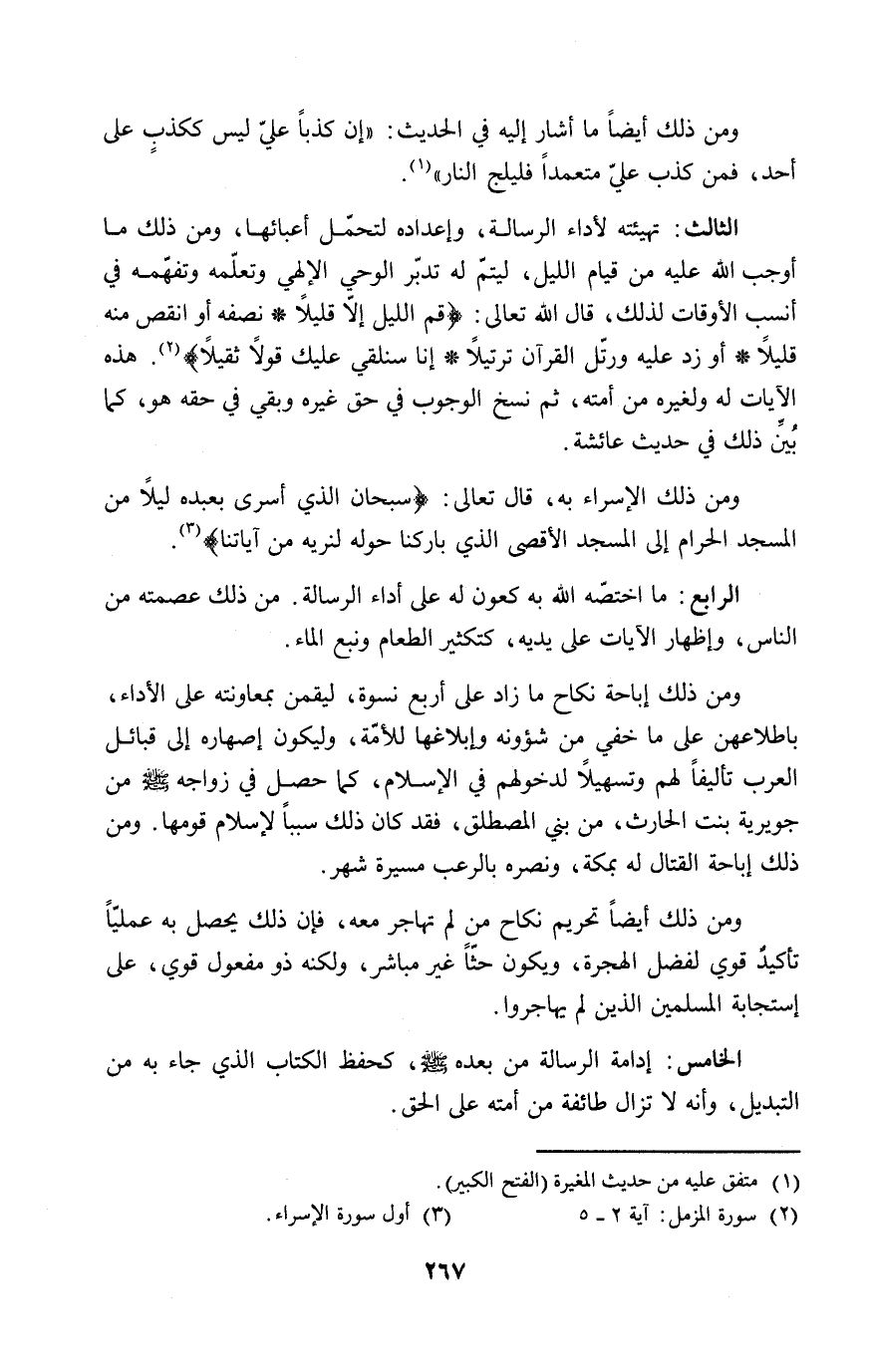 الثالث: تهيئته لأداء الرسالة، وإعداده لتحمّل أعبائها، ومن ذلك ما أوجب الله عليه من قيام الليل، ليتمّ له تدبّر الوحي الإلهي وتعلّمه وتفهّمه في أنسب الأوقات لذلك، قال الله تعالى: {قم الليل إلاّ قليلاً * نصفه أو انقص منه قليلاً * أو زد عليه ورتّل القرآن ترتيلاً * إنا سنلقي عليك قولاً ثقيلاً} (٢). هذه الآيات له ولغيره من أمته، ثم نسخ الوجوب في حق غيره وبقي في حقه هو، كما بُيِّنَ ذلك في حديث عائشة.