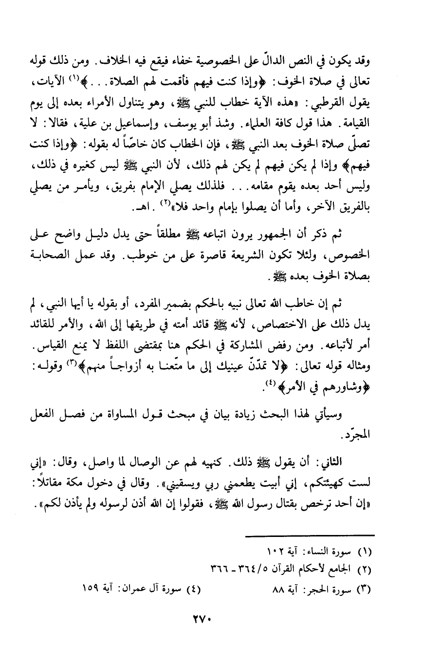 ثم ذكر أن الجمهور يرون اتباعه - صلى الله عليه وسلم - مطلقاً حتى يدل دليل واضح على الخصوص، ولئلا تكون الشريعة قاصرة على من خوطب. وقد عمل الصحابة بصلاة الخوف بعده - صلى الله عليه وسلم -.