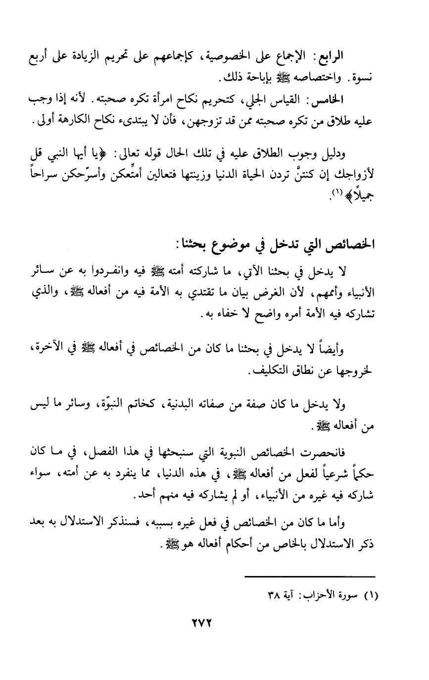 الرابع: الإجماع على الخصوصية، كإجماعهم على تحريم الزيادة على أربع نسوة. واختصاصه - صلى الله عليه وسلم - بإباحة ذلك.