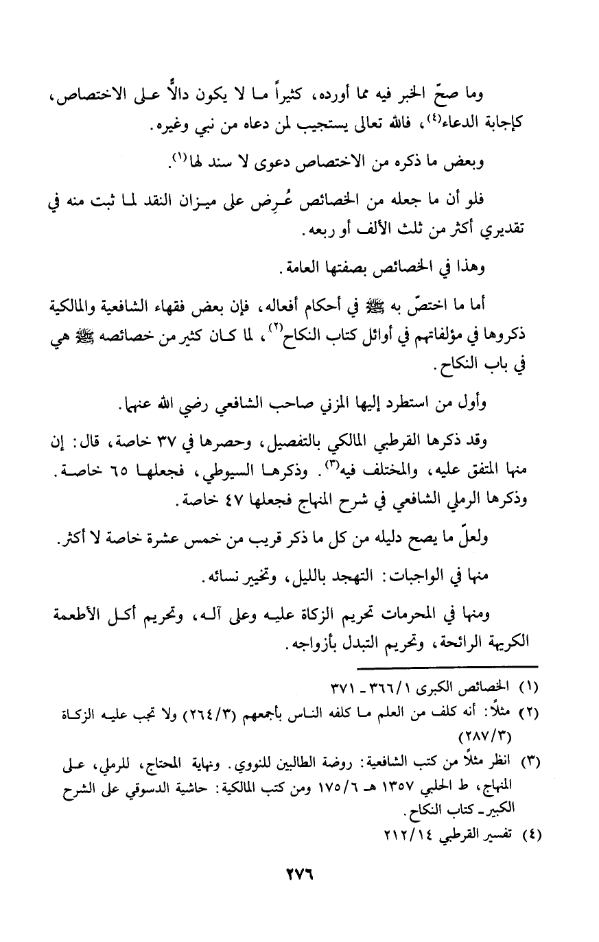 وقد ذكرها القرطبي المالكي بالتفصيل، وحصرها في ٣٧ خاصة، قال: إن منها المتفق عليه، والمختلف فيه (٤). وذكرها السيوطي، فجعلها ٦٥ خاصة. وذكرها الرملي الشافعي في شرح المنهاج فجعلها ٤٧ خاصة.
